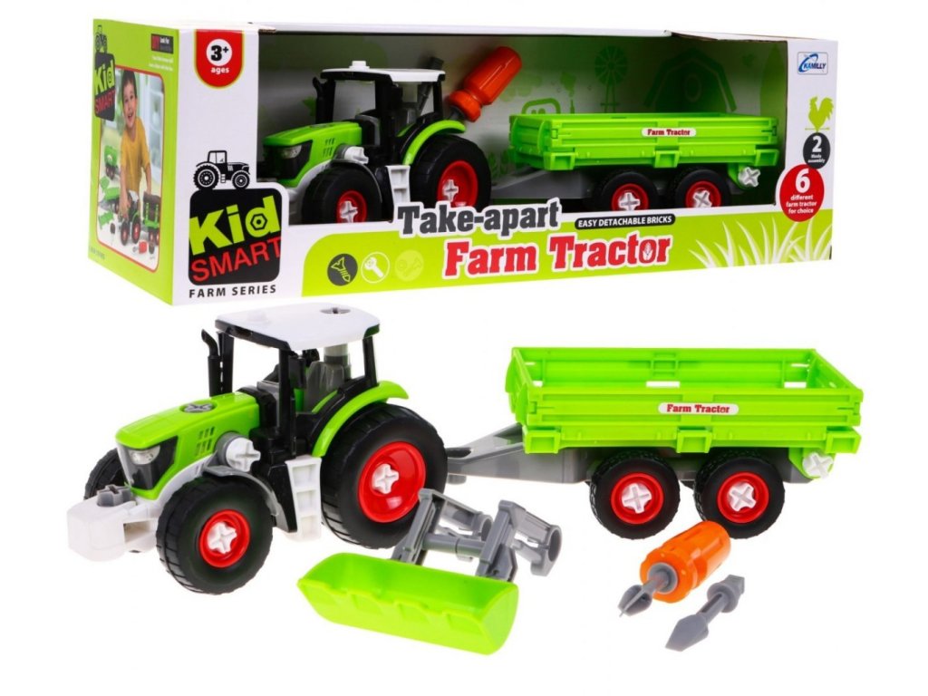 Veľký skrutkovací traktor s prívesom je ideálnou hračkou pre rozvoj manuálnej zručnosti a logického myslenia. Možno ho kompletne rozobrať na jednotlivé diely a skrutky potom zase zložiť pomocou priloženého skrutkovača s dvoma nadstavcami. Zábava je tak nekonečná. Hračka je určená pre deti od 36 mesiacov .