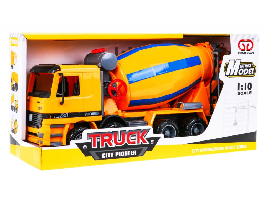 Veľké detské auto - miešačka na betón City Pioneer je ideálnou hračkou pre rozvoj manuálnej zručnosti a logického myslenia. Je vybavená otočným bubnom, ktorý sa otáča pomocou bočného červeného kolieska, v zadnej časti má násypku a žľab na vypúšťanie "betónu". Kabína je naklápacia ako u skutočného auta. Pohon zabezpečuje zotrvačník na predných kolesách. Hračka je určená pre deti od 36 mesiacov veku.