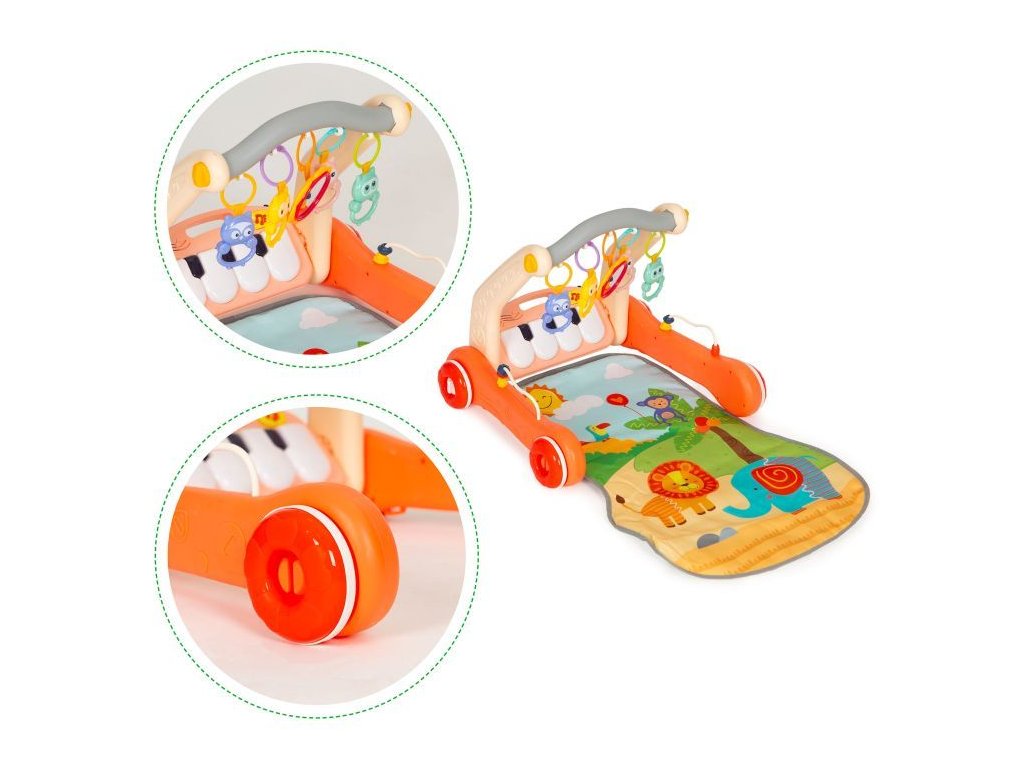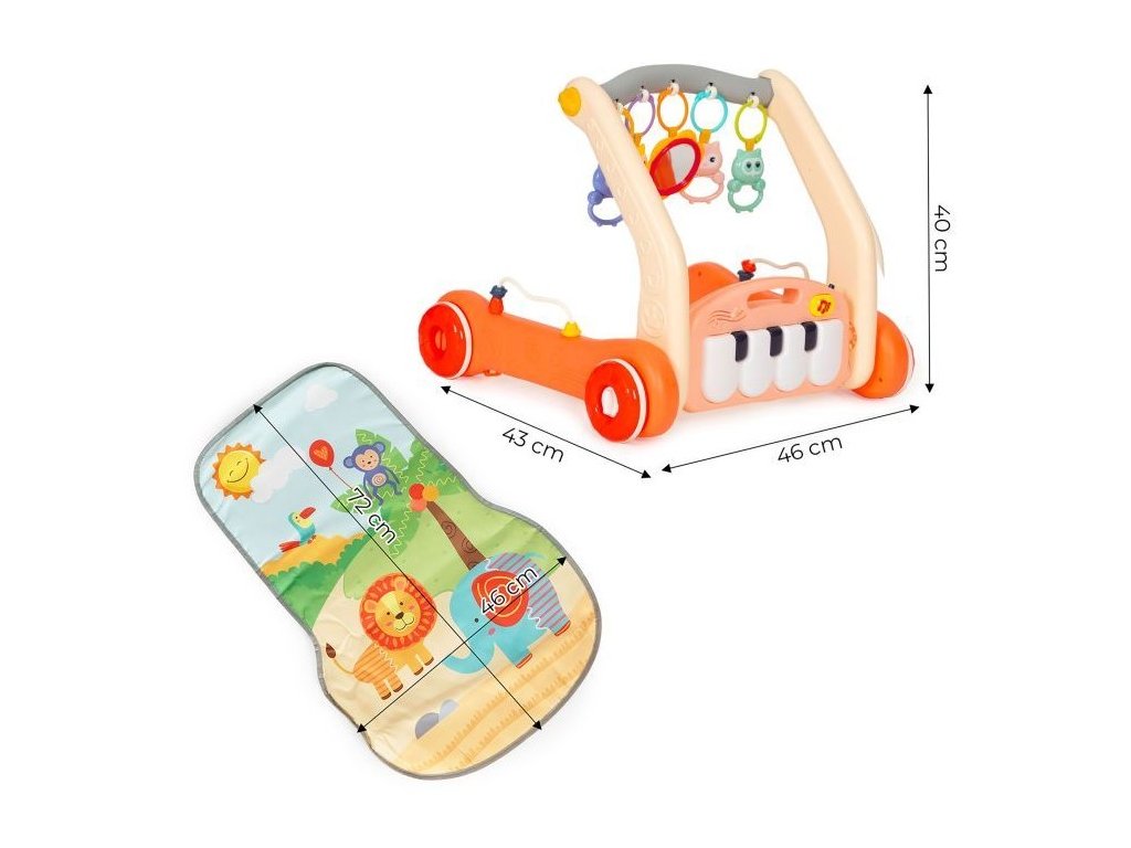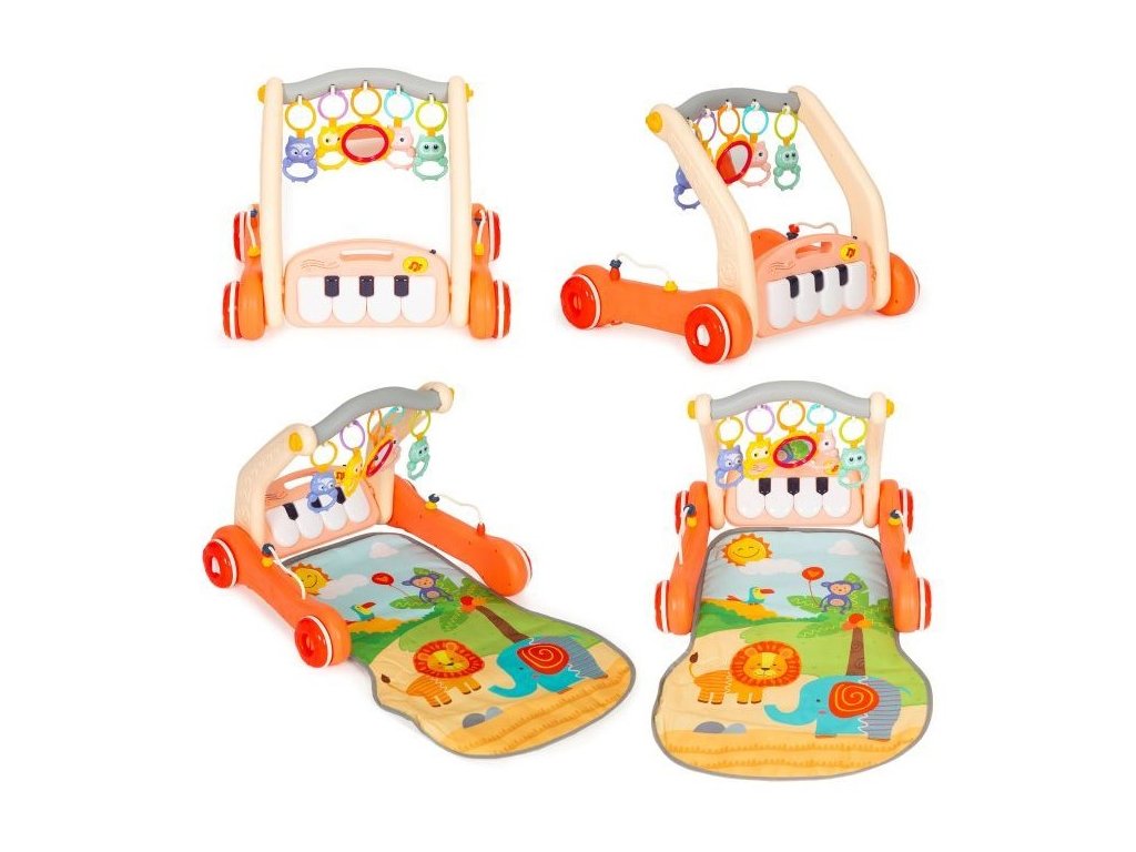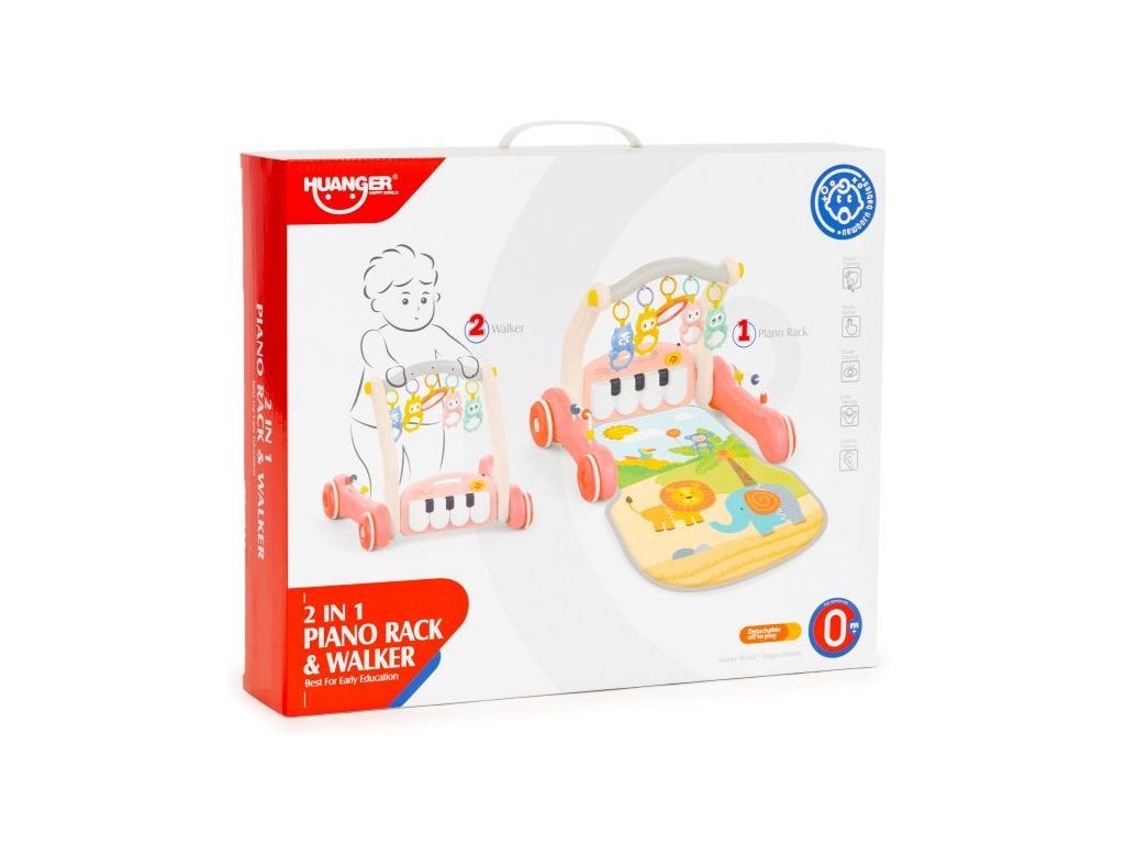 Chodítko s hracou dekou Haunger 2v1 Rack Walker je určené Vášmu dieťaťu už od narodenia. Súčasťou deky je hrazdička, ktorá slúži aj ako madlo chodítka so zavesenými hrkálkami a malinkým zrkadlom a tiež pianko, ktoré svieti a hrá melódie. Dieťa sa môže v ľahu hrať s hrkálkami a sledovať sa pri tom v zrkadle a pianko môže byť využité ako uspávacie melódie. Na bruchu sa dieťa naučí zdvíhať hlavičku a pozorovať veci okolo seba, pomôže mu k prvým krôčikom a zároveň oddeľuje dieťa od chladnej podlahy.