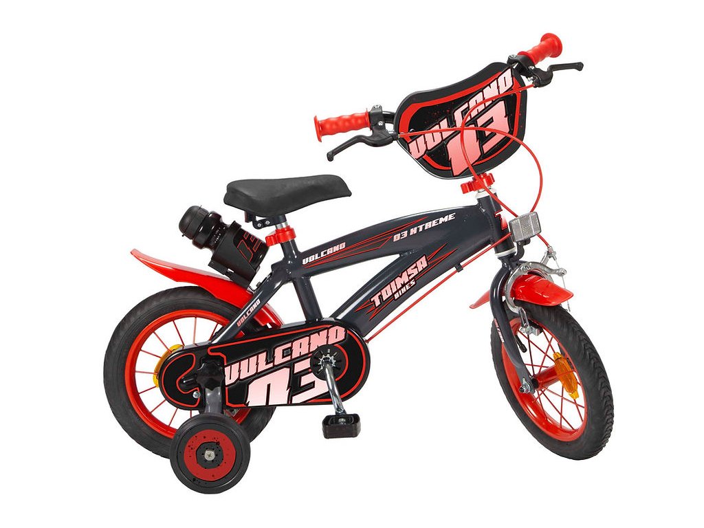 Originálny detský bicykel od španielskeho výrobcu Toimsa Vulcano s veľkosťou ráfikov 12 palcov je určený pre najmenšie deti vo veku od 3 do 4,5 roka s výškou do 95 cm. Bicykel je opatrený demontovateľnými kolieskami, dieťa sa teda bude cítiť hneď od prvej jazdy bezpečne a stabilne. Bicykel je vybavený 2 druhmi bŕzd. Brzdenie prebieha buď zadnou bubnovou brzdou alebo je možno použiť prednú pákovú brzdu. Obe brzdy sa ovládajú páčkami na riadidlách. Proti nechcenému namotaniu nohavice alebo šnúrky do reťaze má koleso kryt s farebnou potlačou, ktorý zakrýva celú reťaz. Sedadlo aj kormidlo sú výškovo nastaviteľné.