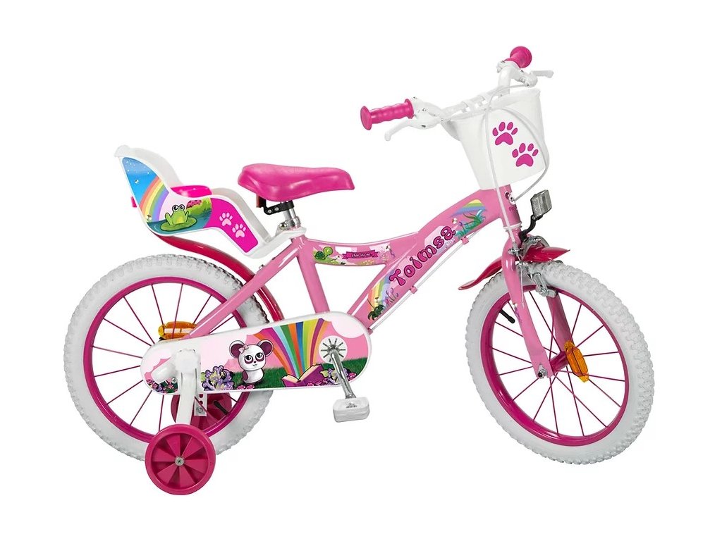 Originálny detský bicykel od španielského výrobcu Toimsa fantasy s veľkosťou ráfikov 16 palcov je určený pre deti vo veku od 4 do 6 rokov s výškou do 105 cm. Bicykel je opatrený demontovateľnými balančnými kolieskami, dieťa sa teda bude cítiť hneď od prvej jazdy bezpečne a stabilne. Bicykel je vybavený 2 druhmi bŕzd. Brzdenie prebieha buď zadnou bubnovou brzdou alebo je možno použiť prednú pákovú brzdu. Obe brzdy sa ovládajú páčkami na riadidlách. Proti nechcenému namotaniu nohavice alebo šnúrky do reťazu má koleso kryt s farebnou potlačou, ktorý zakrýva celú reťaz. Sedadlo aj riaditká sú výškovo nastaviteľné. V zadnej časti je pripevnený nosič na bábiku.