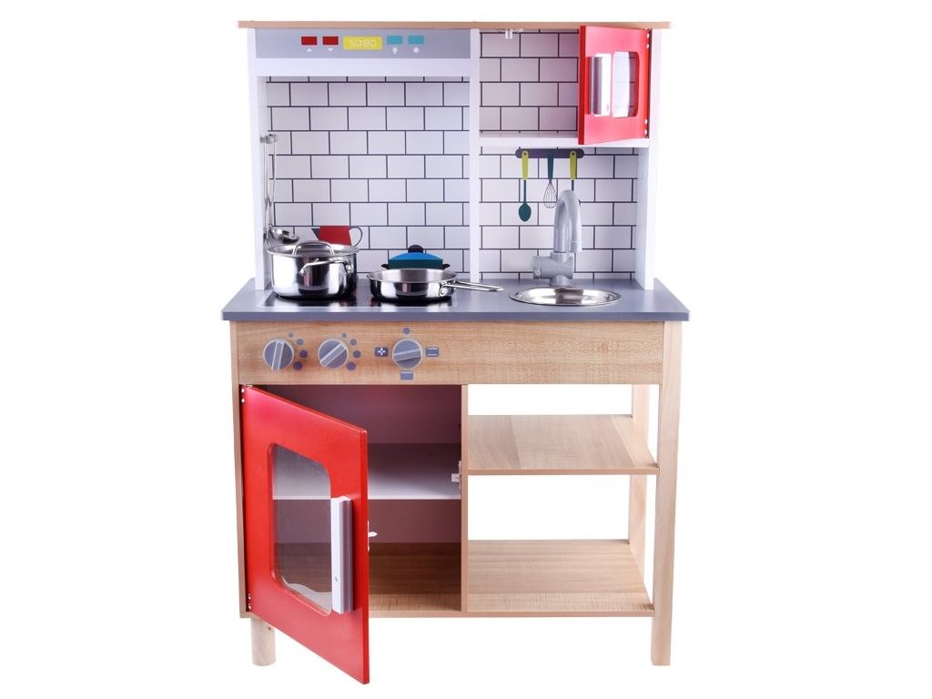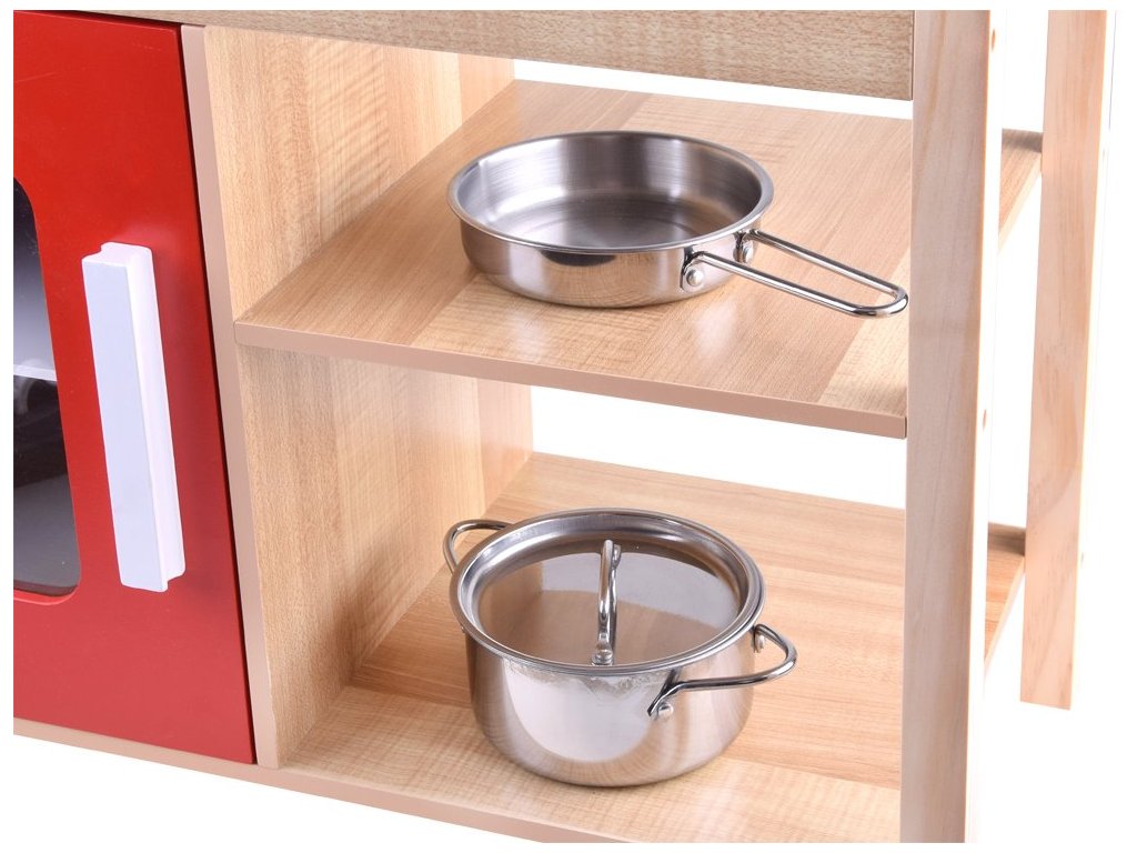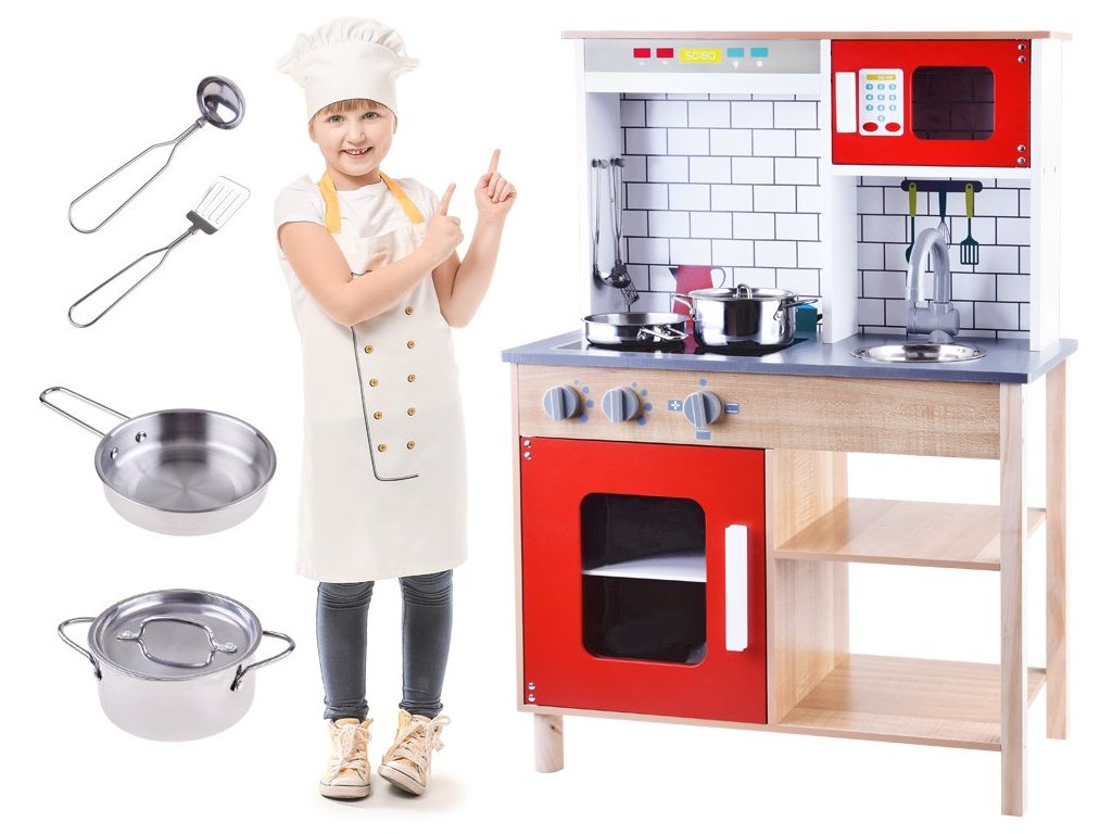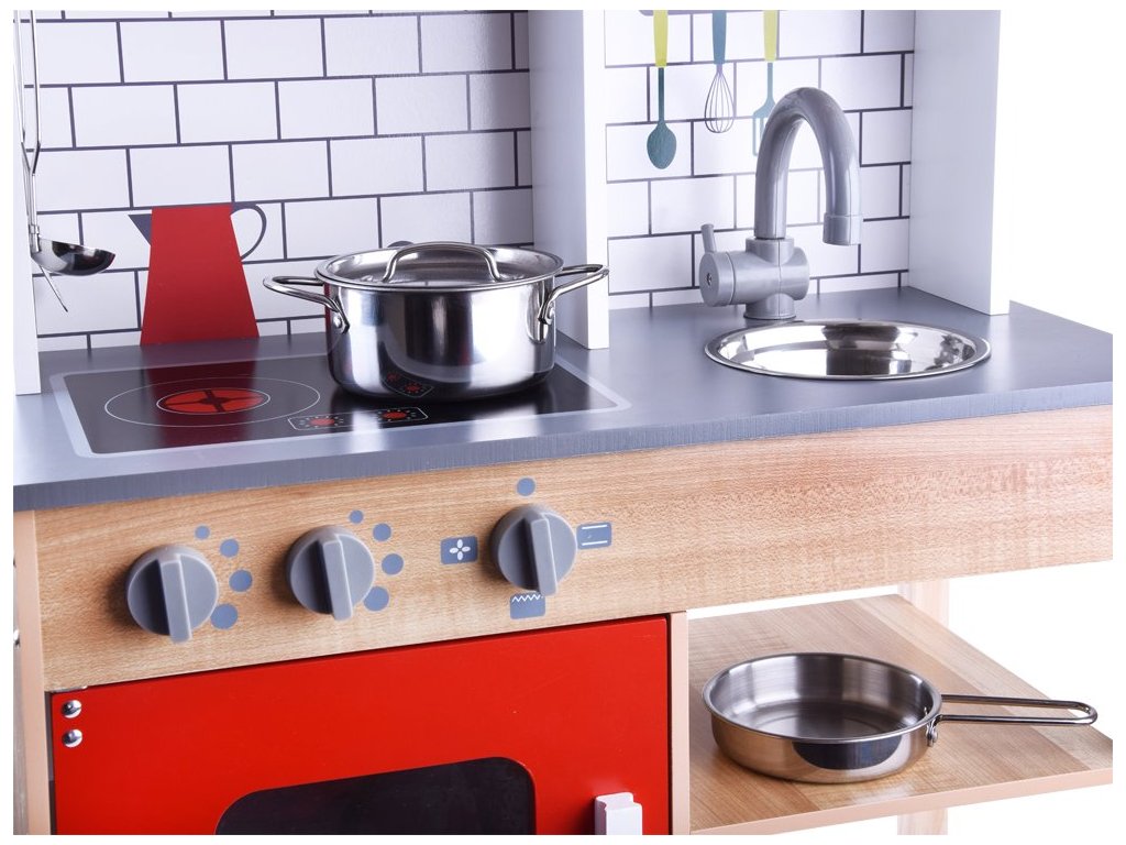 Drevená detská kuchynka Red Kitchen s príslušenstvom je určená pre deti od 3 rokov veku. Je vybavená celkom 5 kusmi hliníkového riadu. Nájdete tu hrniec, pokrievku, panvicu, naberačku a obracačku. Vaše dieťa sa určite s touto veľkou kuchynkou nudiť nebude. Mikrovlnná rúra a spodná skrinka sú otváracie. Otočné sú tiež vypínače pri sporáku. Je vyrobená zo dreva v pestrofarebnom prevedení.