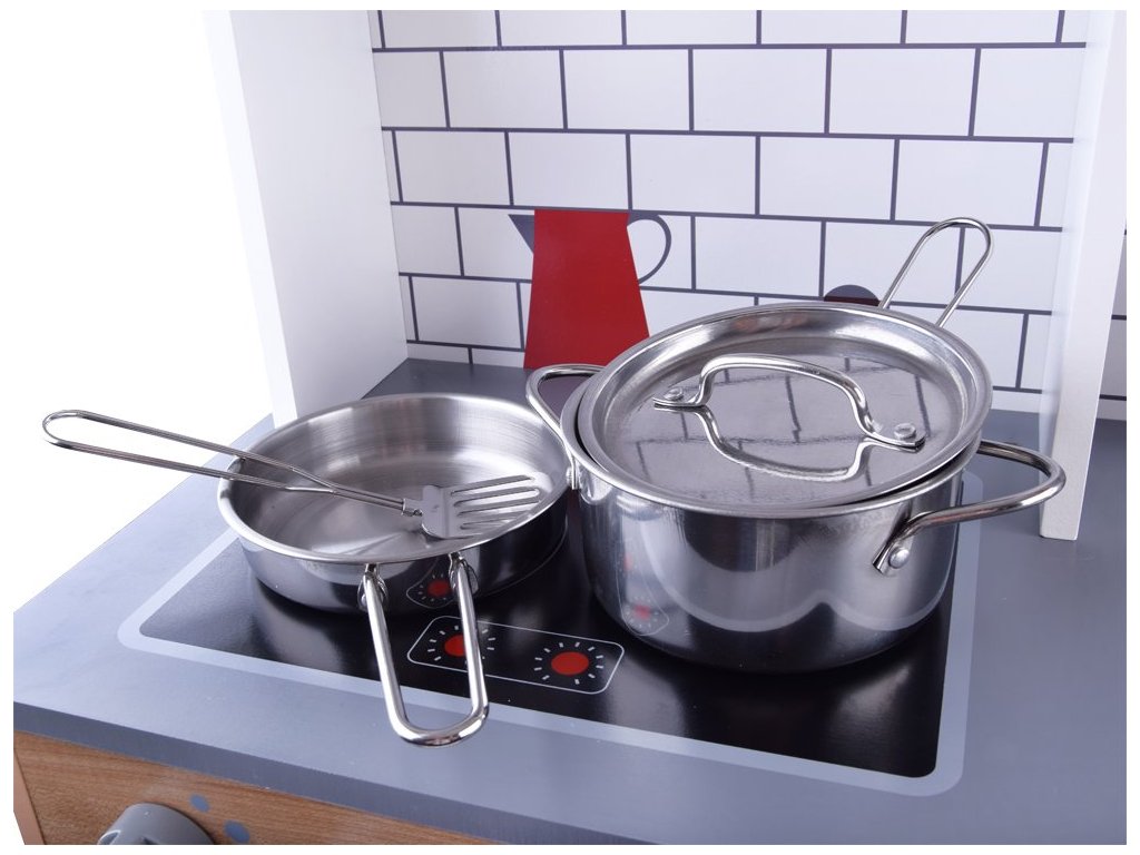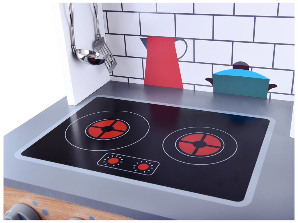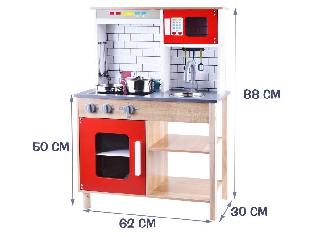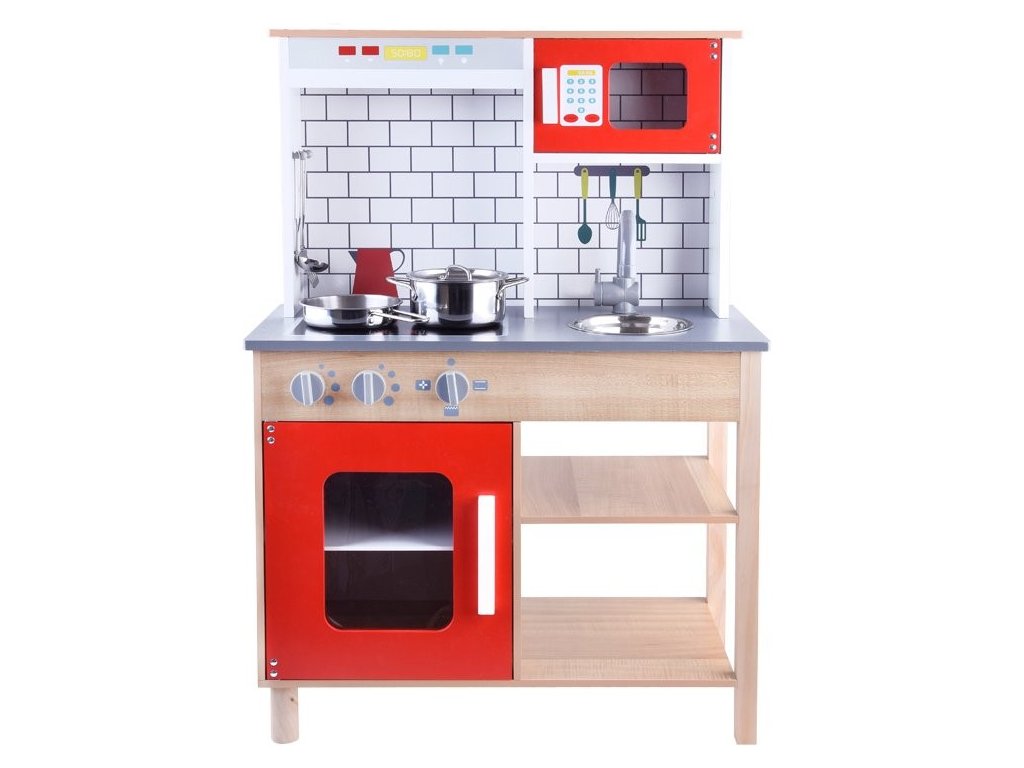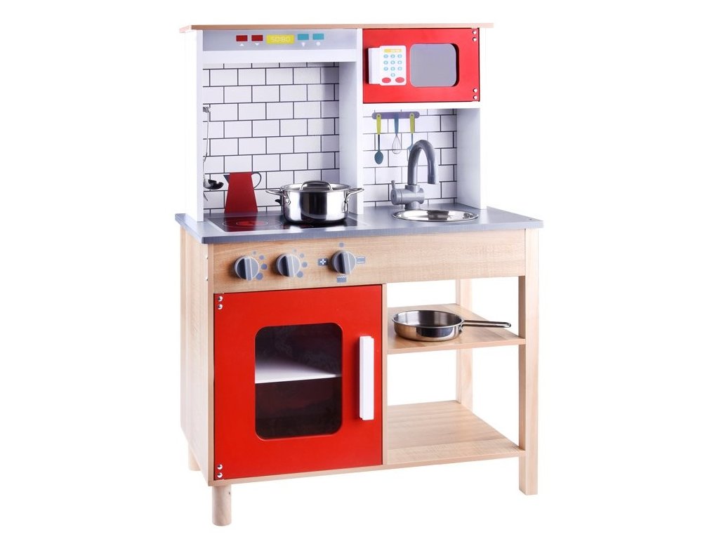 Drevená detská kuchynka Red Kitchen s príslušenstvom je určená pre deti od 3 rokov veku. Je vybavená celkom 5 kusmi hliníkového riadu. Nájdete tu hrniec, pokrievku, panvicu, naberačku a obracačku. Vaše dieťa sa určite s touto veľkou kuchynkou nudiť nebude. Mikrovlnná rúra a spodná skrinka sú otváracie. Otočné sú tiež vypínače pri sporáku. Je vyrobená zo dreva v pestrofarebnom prevedení.