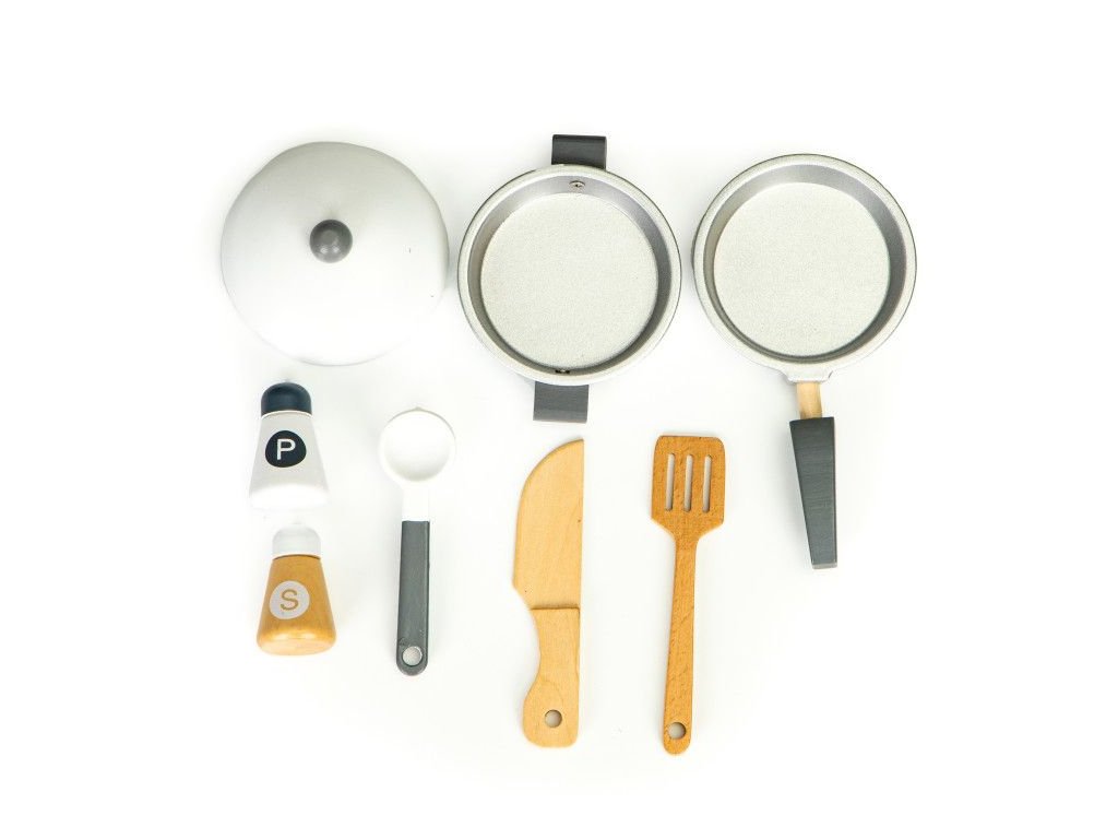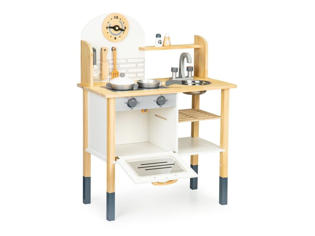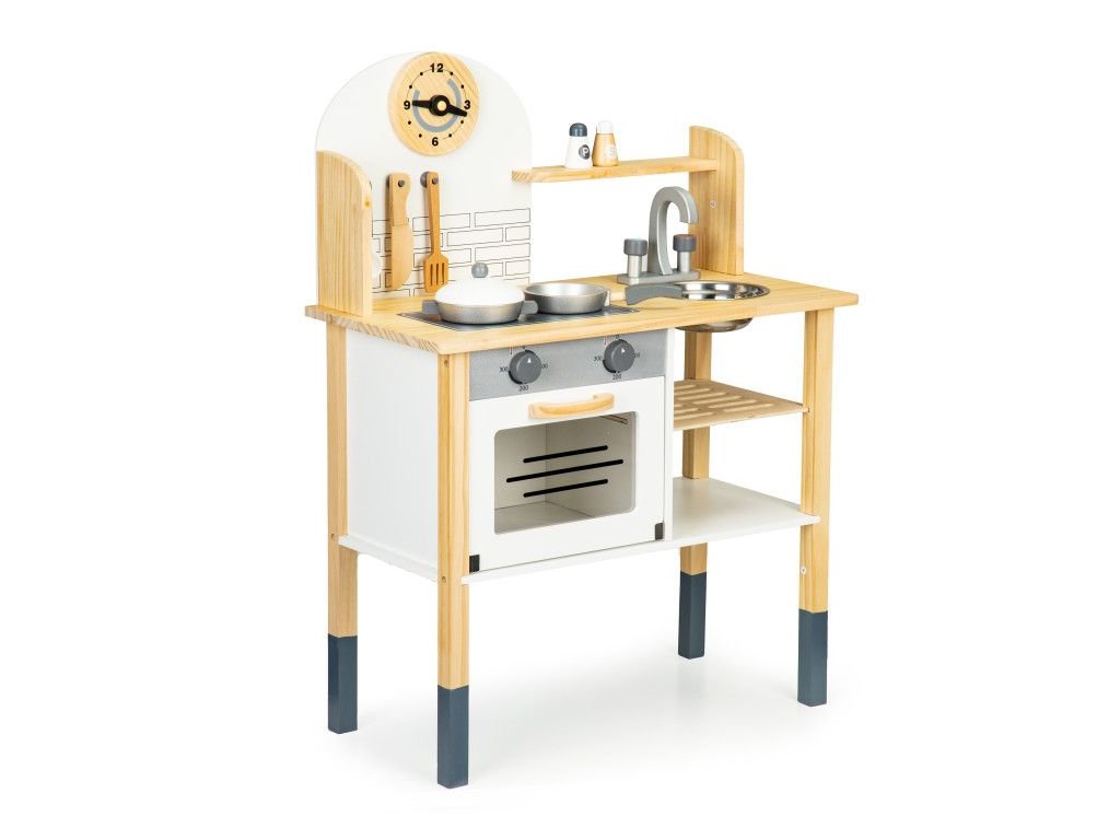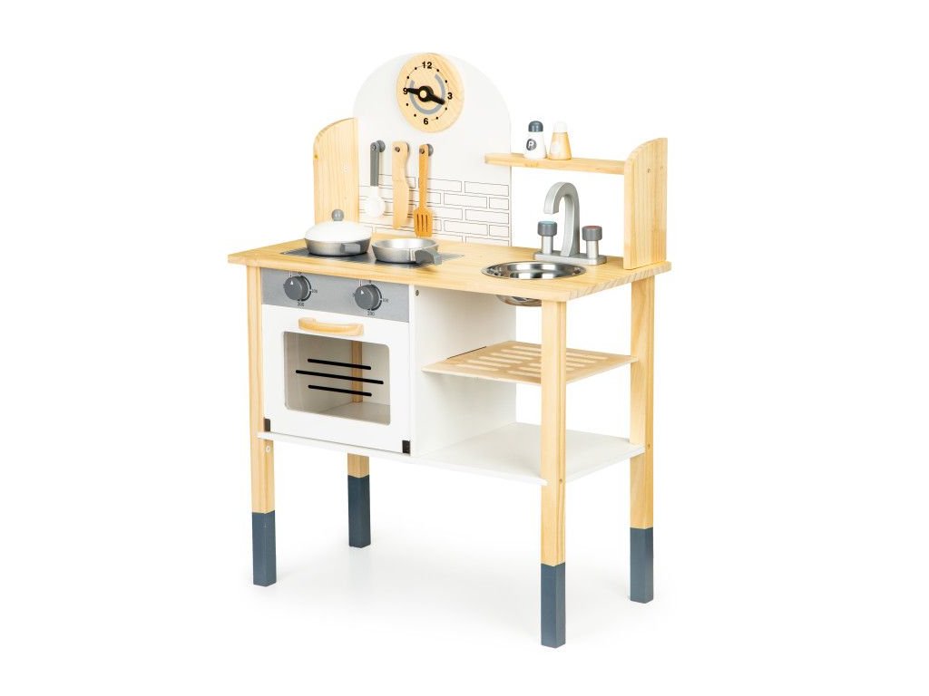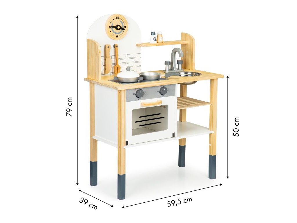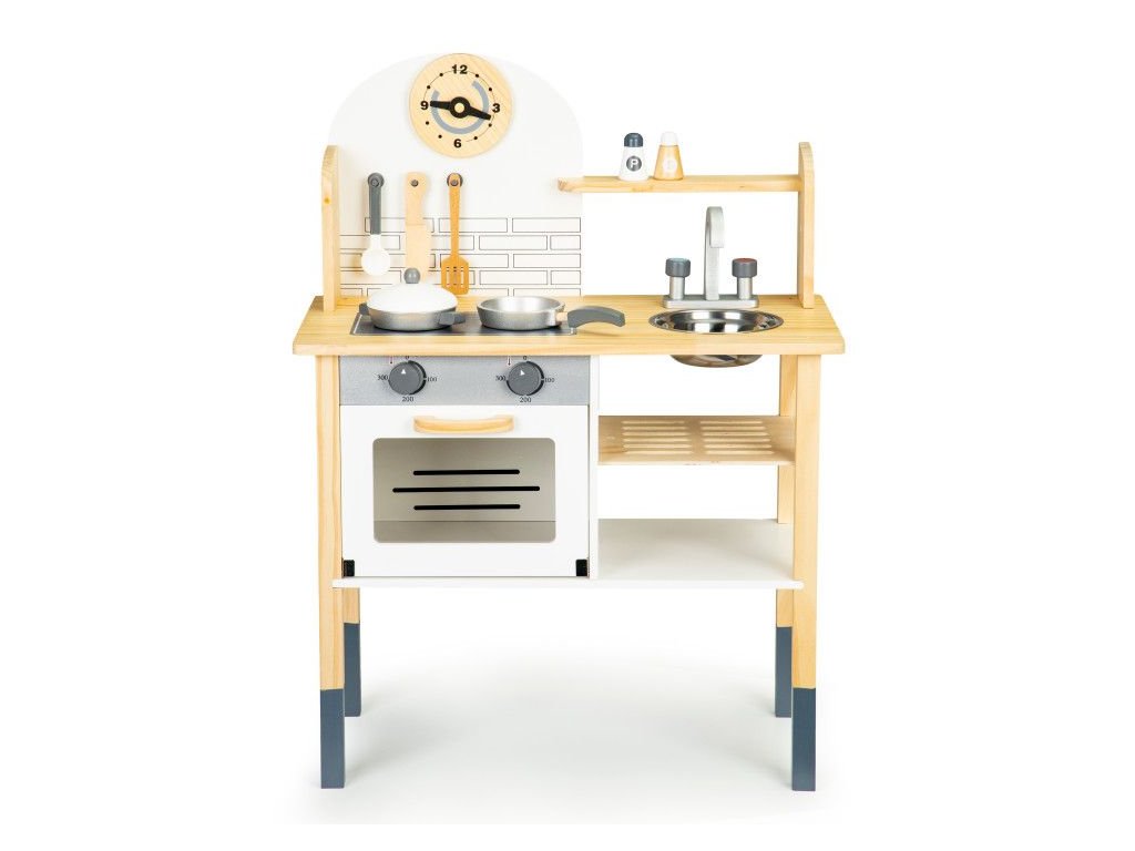 Drevená detská kuchynka Ecotoys Clock Kitchen s vybavením je určená pre deti od 3 rokov veku. Je vybavená celkom 8 kusmi dreveného kuchynského riadu. Vaše dieťa sa určite s touto veľkou kuchynkou nudiť nebude. Rúra má otváracie dvierka opatrené magnetom. V kuchynke je tiež drez s kohútikmi a hodinami s ručičkami. Otočné vypínače sporáku vydávajú po otočení zvuk (klik). Kuchynka je vyrobená z dreva bez ostrých hrán v pestrofarebnom prevedení.