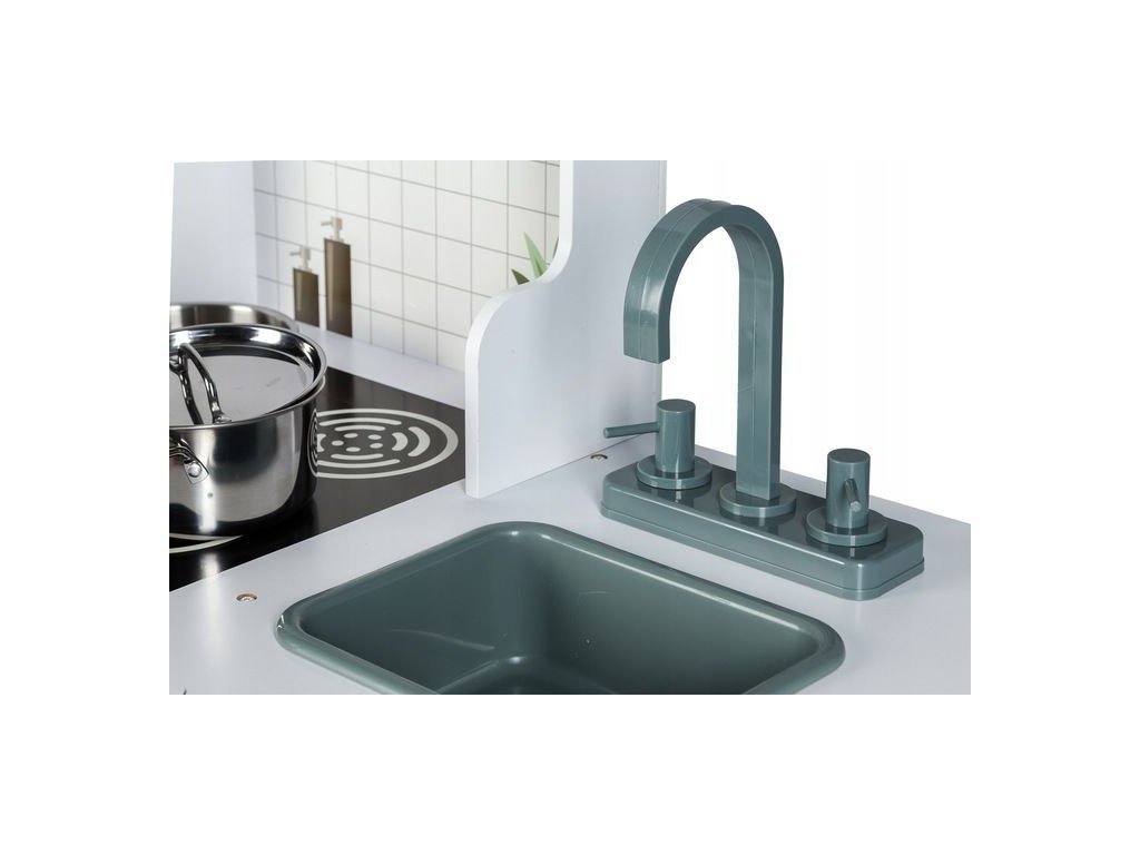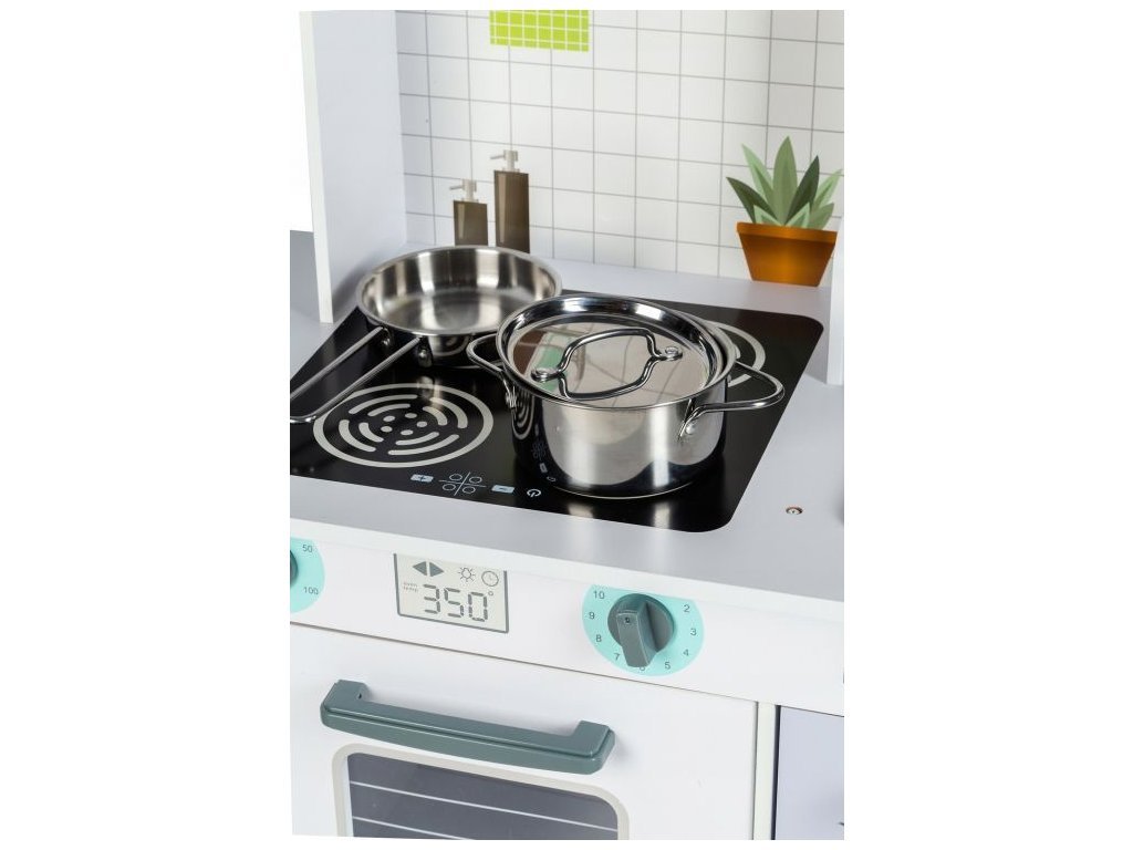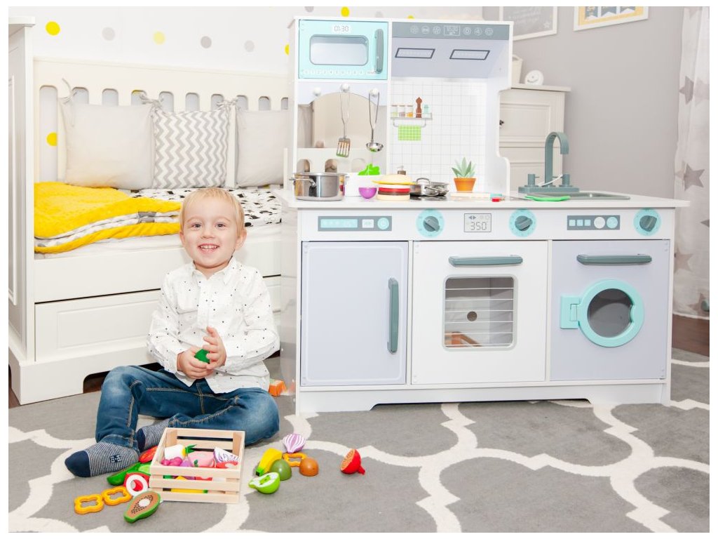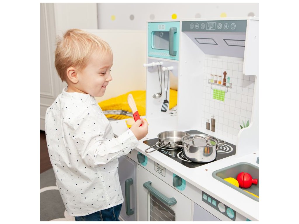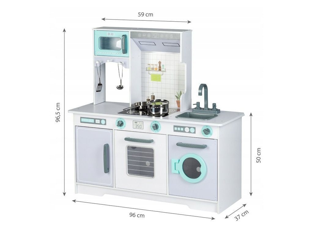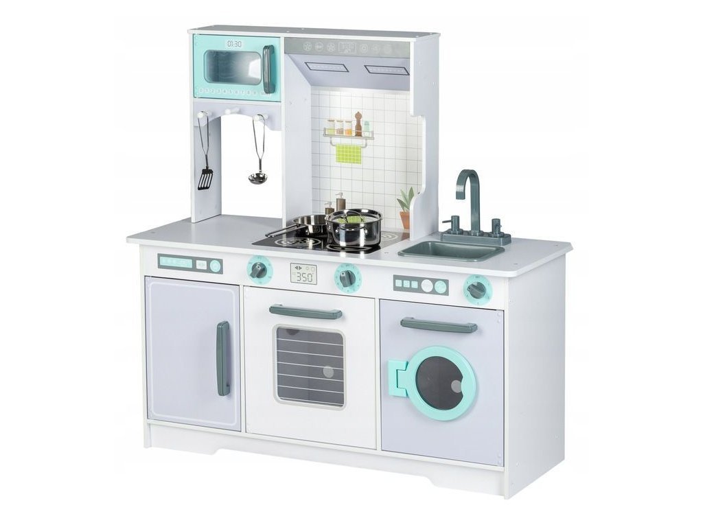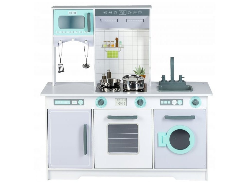 Veľká drevená detská kuchynka Ecotoys s príslušenstvom pre deti od 3 rokov veku. Je vybavená celkom 5 kusmi hliníkového riadu. Vaše dieťa sa určite s touto veľkou kuchynkou nudiť nebude. Mikrovlnka, rúra, skrinka a práčka sú otváracie. Všetky dvierka sú opatrené systémom bezpečného zatvárania. Vďaka policiam a háčikom môže dieťa ľahko v kuchynce udržiavať poriadok. Otočné sú tiež vypínače pri sporáku. Drez s vodovodnými kohútikmi. Je vyrobená len z kvalitného dreva v pestrofarebnom prevedení.