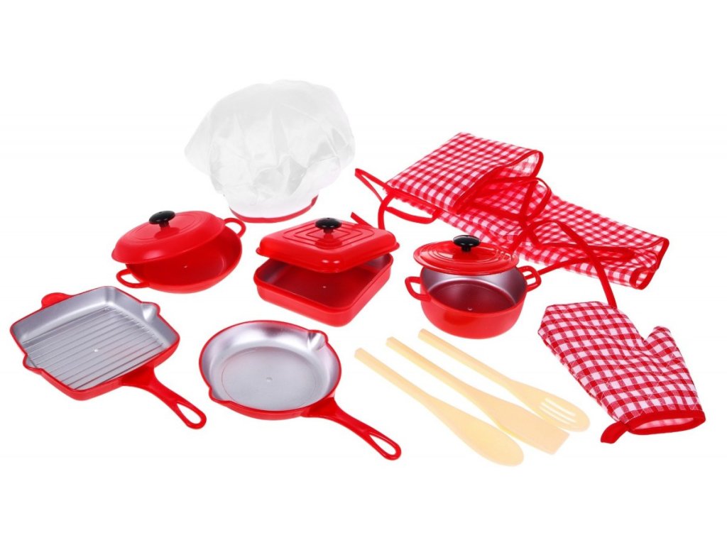 Balenie plastového riadu do detskej kuchynky imituje skutočný riad. Skladá sa celkom zo 14 súčastí a nesmie chýbať v žiadnej detskej kuchynke. Nájdete tu hrnce a panvičky s pokrievkami, varešky, obracačku, ale hlavne kuchársku zásteru, kuchársku čiapku a chňapku. Táto hračka je určená pre deti od 3 rokov .