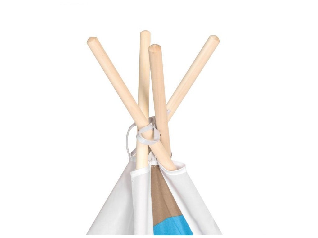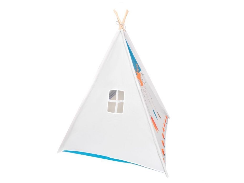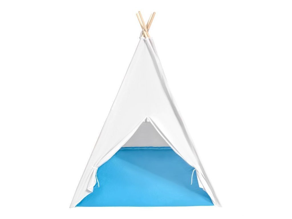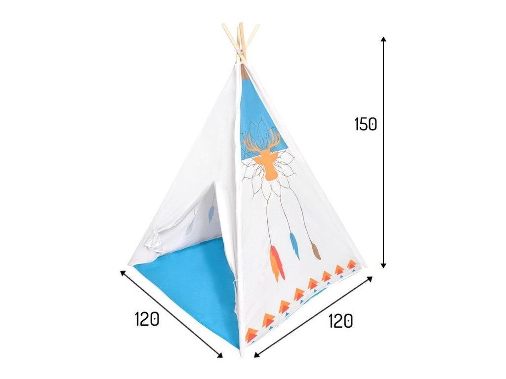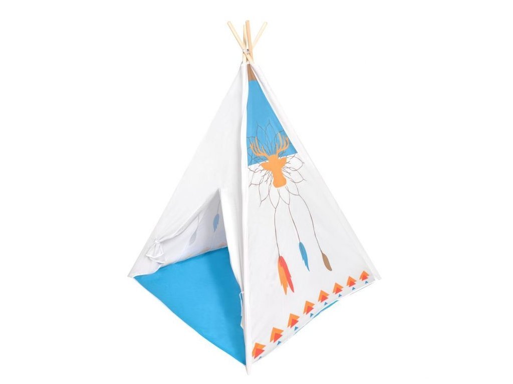 Ecotoys detský indiánsky stan v bielo-modrom prevedení. Vďaka nepremokavej podlahe je vhodný ako do vnútorných priestorov tak aj pre vonkajšie použitie. Vchod do stanu je variabilný, môžete tak nastaviť množstvo svetla, ktoré bude prenikať do vnútra stanu. Konštrukcia stanu je drevená, vrchný materiál je polyester. Montáž stanu je veľmi a jednoduchá a rýchla, čo oceníte najmä pri jeho premiestňovaní. V zadnej časti je umiestnené praktické okienko.