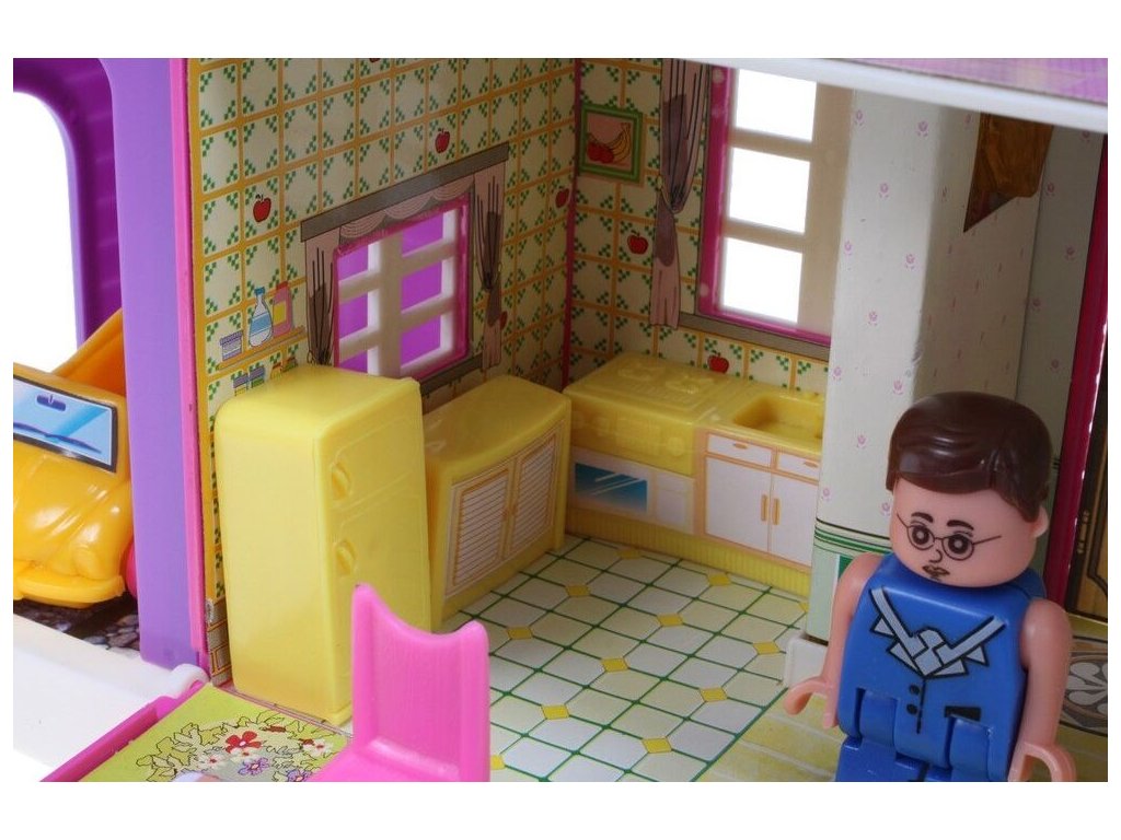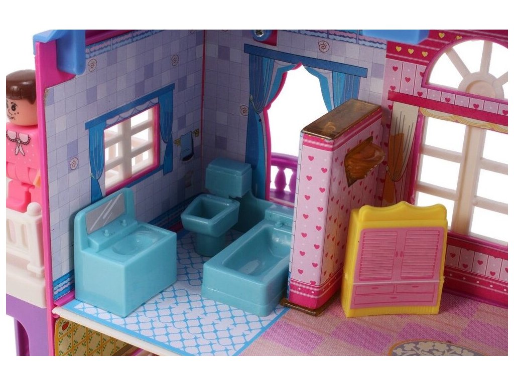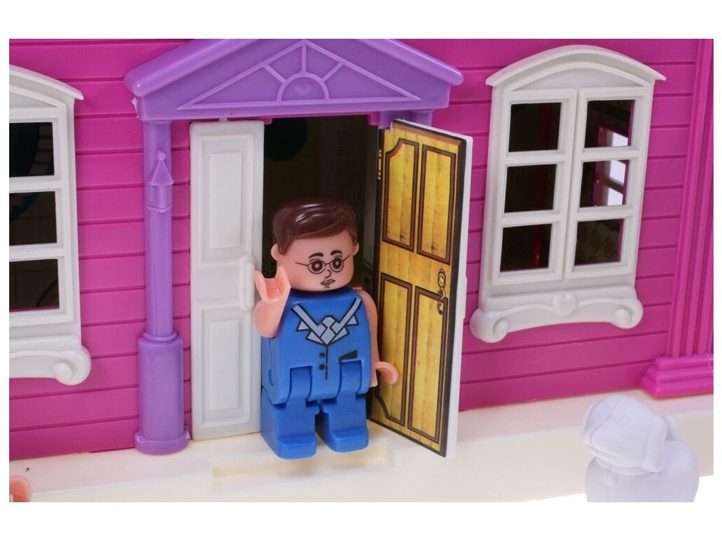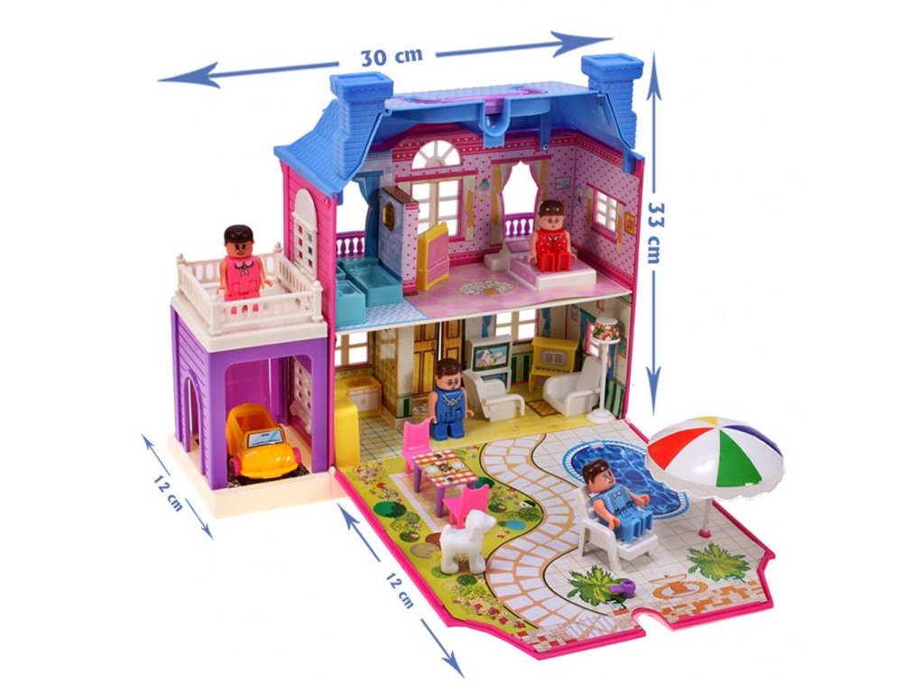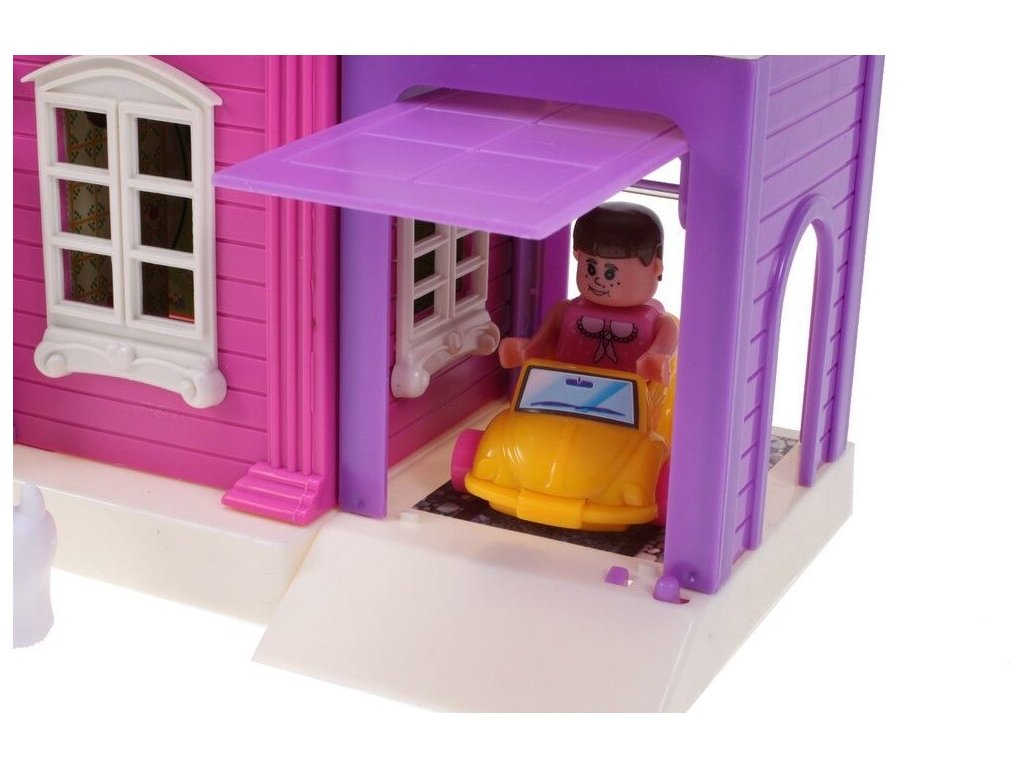 Nádherný plastový domček pre bábiky s 2 poschodiami je snom každej malej princeznej. Domček je vybavený nábytkom ktorý je možné ľubovoľne premiestňovať. Nájdete v ňom stôl, stoličky, posteľ, chladničku, skrine a ďalšie prvky. Garáž domčeka je otváracia a má aj vnútorné osvetlenie. Pre ešte väčšiu zábavu sú súčasťou domčeka 4 figúrky a psík. Na streche je umiestnený praktický úchyt, domček je teda možné ľahko prenášať. Hračka je určená pre deti od 3 rokov.