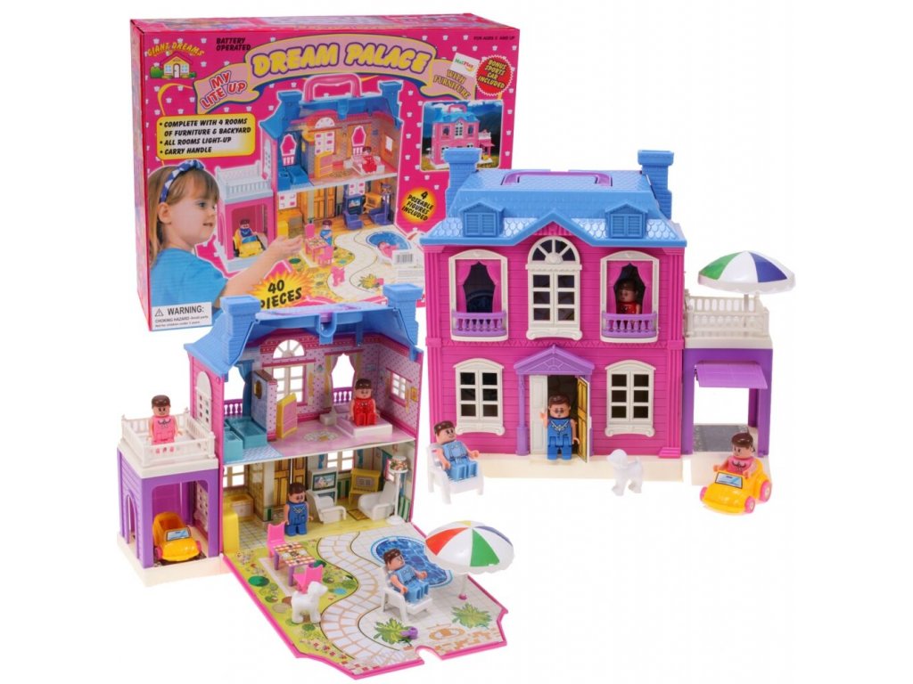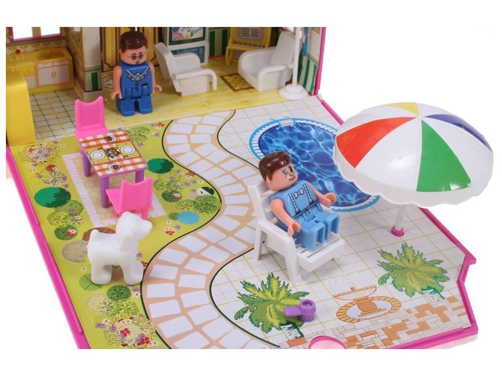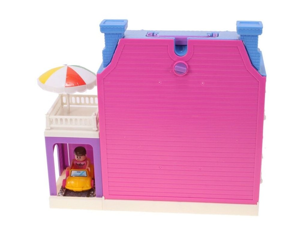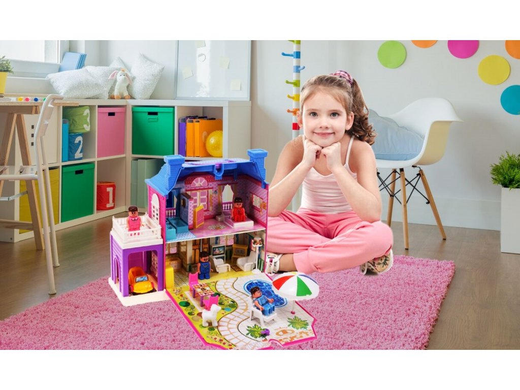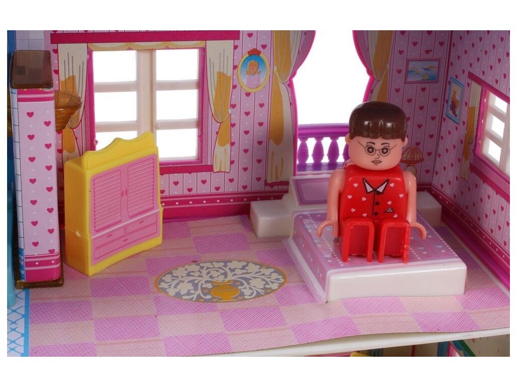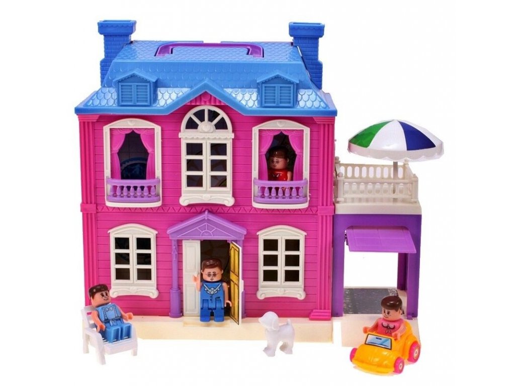 Nádherný plastový domček pre bábiky s 2 poschodiami je snom každej malej princeznej. Domček je vybavený nábytkom ktorý je možné ľubovoľne premiestňovať. Nájdete v ňom stôl, stoličky, posteľ, chladničku, skrine a ďalšie prvky. Garáž domčeka je otváracia a má aj vnútorné osvetlenie. Pre ešte väčšiu zábavu sú súčasťou domčeka 4 figúrky a psík. Na streche je umiestnený praktický úchyt, domček je teda možné ľahko prenášať. Hračka je určená pre deti od 3 rokov.