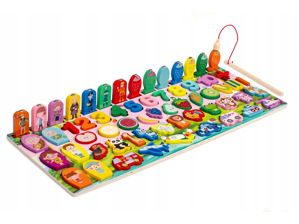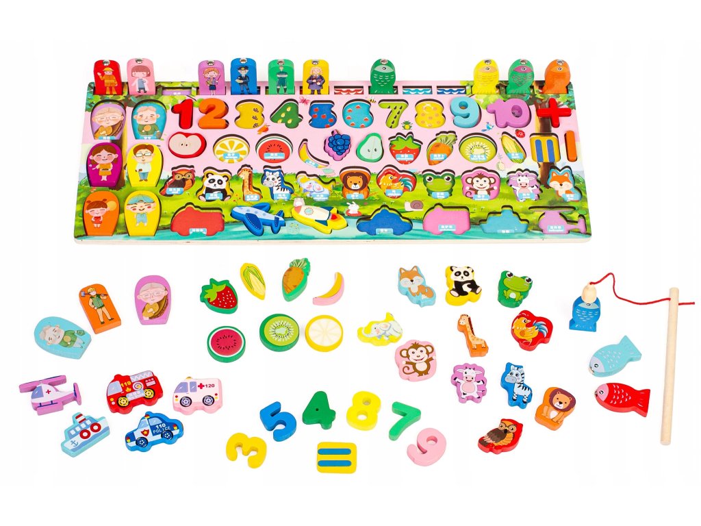 Doris drevená edukačná vkladačka 5v1 Alphanumeric Pairing ponúka deťom niekoľko možností hry. Naučia ich rozpoznávať farby a tvary, počítať a tiež angličtinu kedy sú na podložke vpísané anglické názvy. A navyše môže loviť drevené rybičky s magnetom pomocou priloženej udičky. Súčasťou sady je mimo podložky veľké množstvo kociek v rôznych tvaroch as rôznymi obrázkami. Hračka je určená pre deti od 36 mesiacov veku.