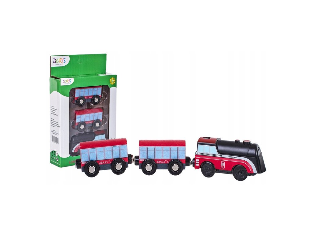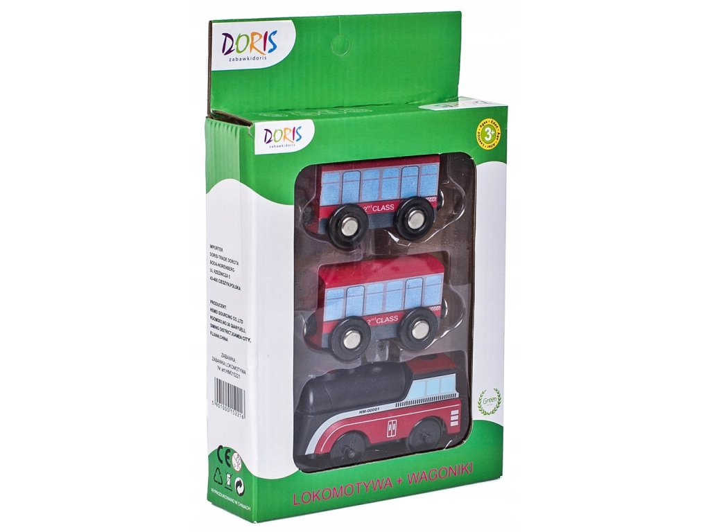 Doris drevený vláčik s lokomotívou učí deti predstavivosť a podporuje kreativitu a je skvelou zábavou pre chlapcov aj dievčatká. Lokomotíva je poháňaná batériou a 2 vagóniky sa pripájajú pomocou magnetu. Všetko je vyrobené z dreva v pestrofarebnom prevedení bez ostrých hrán. Hračka je určená pre deti od 36 mesiacov . Vláčik je kompatibilný so všetkými železničnými dráhami Doris.