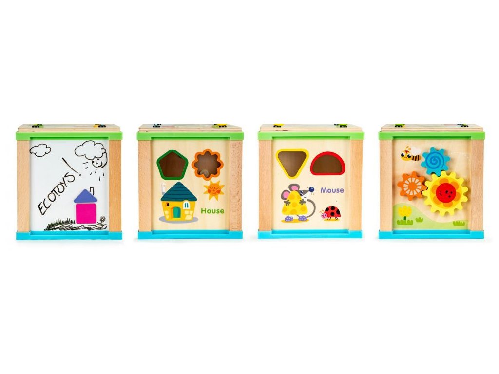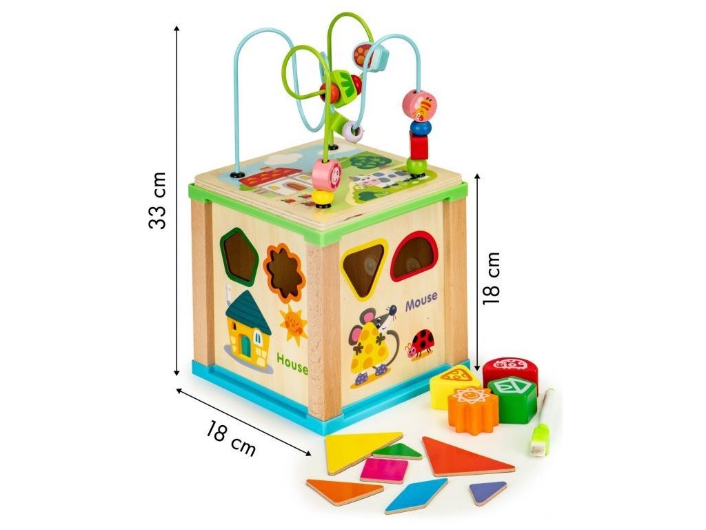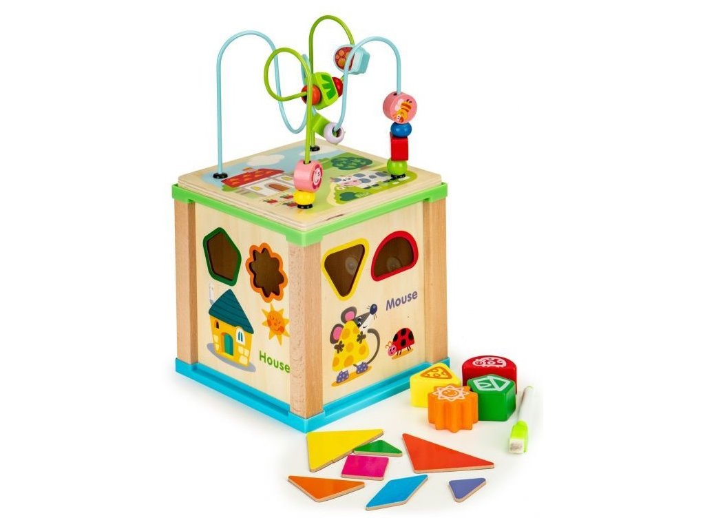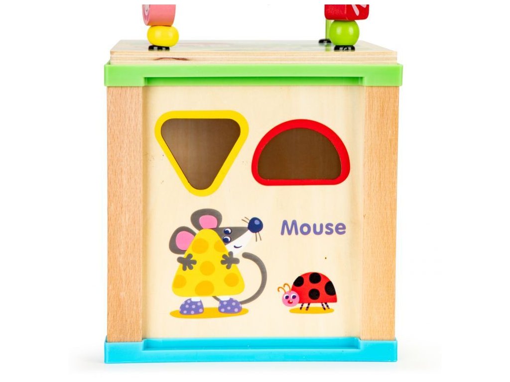 Drevená edukačná kocka Mouse Cube 5v1. Na hornom odnímateľnom kryte je umiestnená kovová konštrukcia s korálkami, ktoré sa môžu ľubovoľne presúvať. Na bočných stenách sú umiestnené otáčacie ozubené kolieska, kresliaca magnetická plocha a vhadzovacie otvory. Vnútorný priestor môže slúžiť na úschovu hračiek. Kocka je ideálnou hračkou pre rozvoj detskej motoriky, hmatu, zraku a logického myslenia. Hračka je určená pre deti od 18 mesiacov veku.
