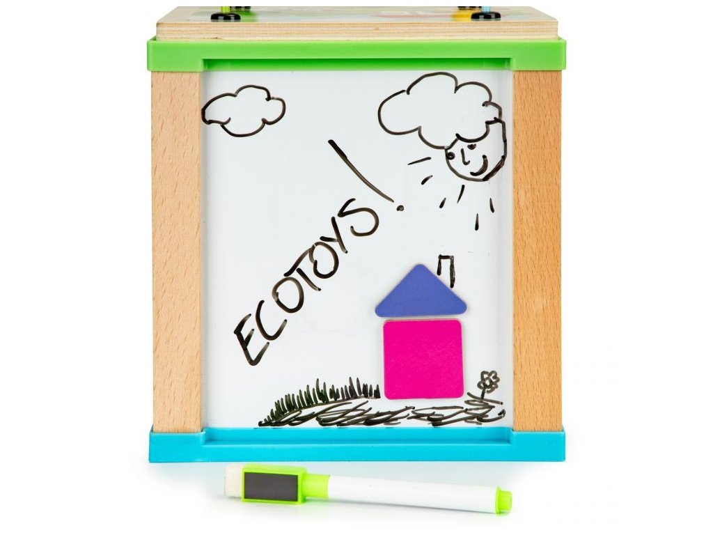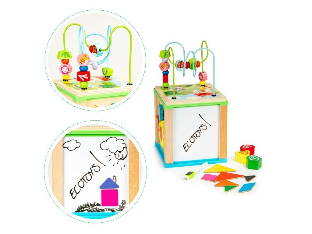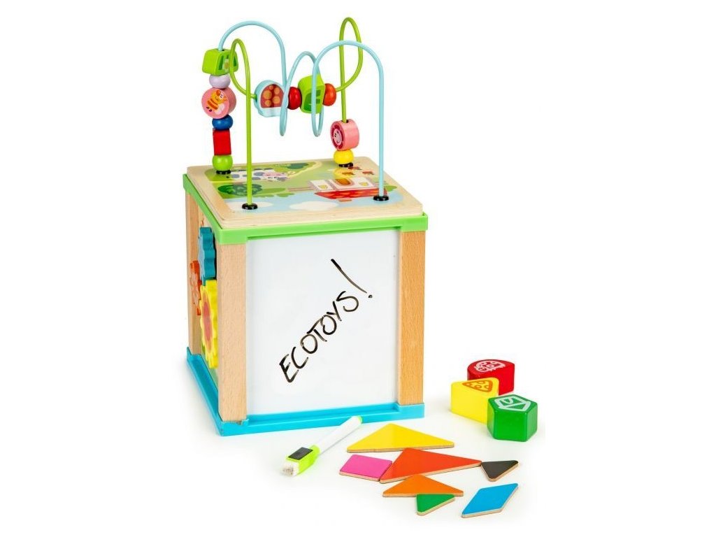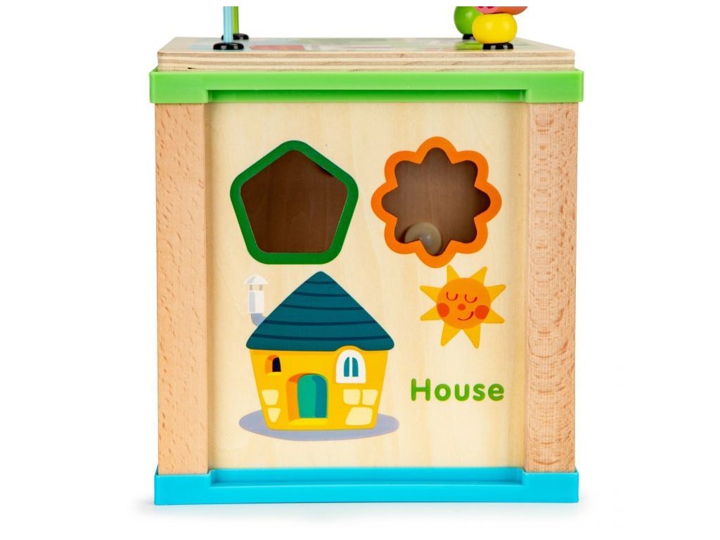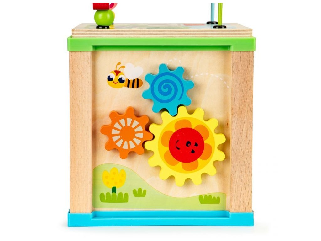 Drevená edukačná kocka Mouse Cube 5v1. Na hornom odnímateľnom kryte je umiestnená kovová konštrukcia s korálkami, ktoré sa môžu ľubovoľne presúvať. Na bočných stenách sú umiestnené otáčacie ozubené kolieska, kresliaca magnetická plocha a vhadzovacie otvory. Vnútorný priestor môže slúžiť na úschovu hračiek. Kocka je ideálnou hračkou pre rozvoj detskej motoriky, hmatu, zraku a logického myslenia. Hračka je určená pre deti od 18 mesiacov veku.