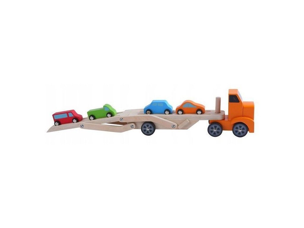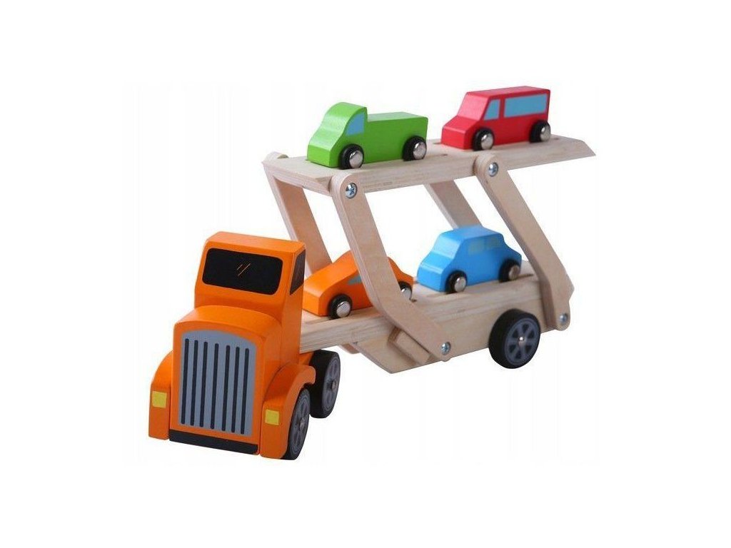 Ecotoys drevené auto so sklápacou rampou a s 4 farebnými autíčkami podporuje u najmenších detí predstavivosť a zlepšuje motoriku. Náves autíčka možno sklopiť a tým môžu autíčka bezpečne schádzať a vchádzať. Na ceste sa náves jednoducho zdvihne. Všetko je vyrobené z kvalitného dreva bez ostrých hrán. Hračka je určená pre deti od 36 mesiacov .