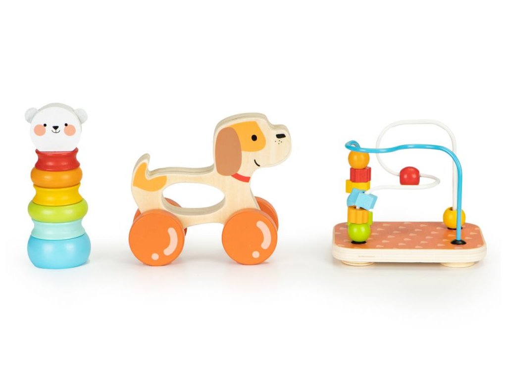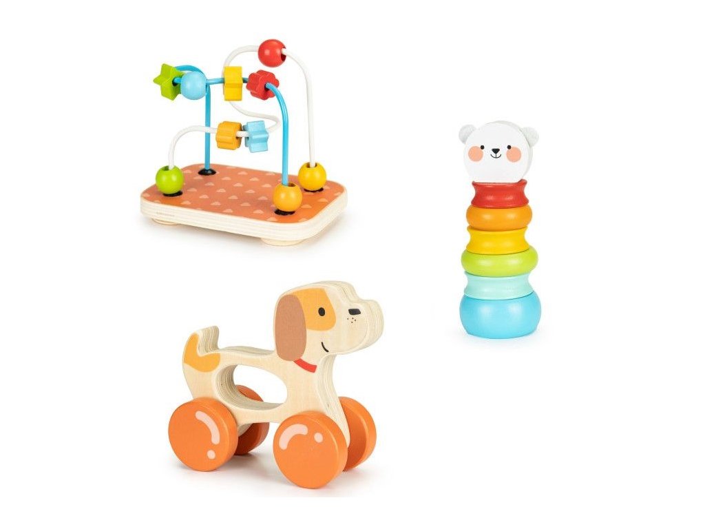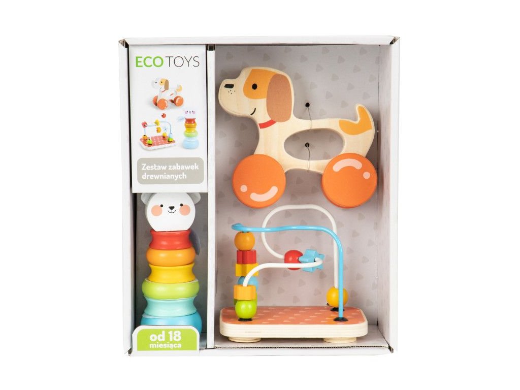 Ecotoys sada drevených hračiek Wooden Toys je určená pre tie najmenšie deti. V sade nájdete psíka s kolieskami, labyrint s korálkami a ukladaciu vežu. Všetko je vyrobené zo dreva v pestrofarebnom prevedení bez ostrých hrán. Hra s nimi podporuje u detí predstavivosť a rozvíja motoriku. Hračka je určená pre deti od 18 mesiacov veku.