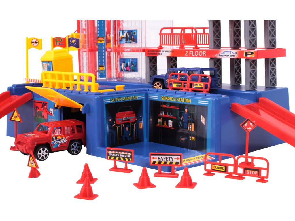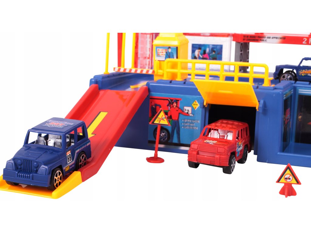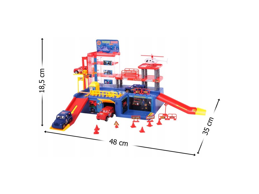 Detská poschodová garáž so 4 autíčkami a helikoptérou. Súčasťou parkoviska je pohyblivý výťah, ktorý umožňuje presúvať autíčka medzi jednotlivými poschodiami, garáž, závora, dopravné značenie, servisná plocha a dráha. Mladý nadšenec tu nájde všetko, čo potrebuje. Je vyrobená z materiálu bez ostrých hrán a určená pre deti od 3 rokov.