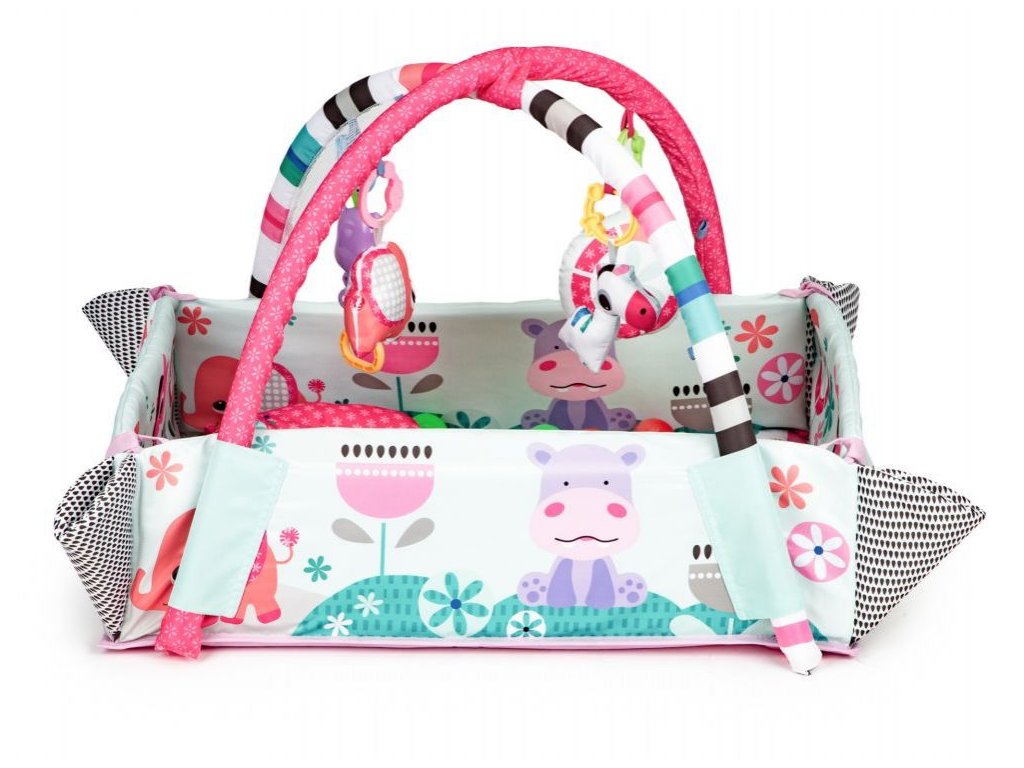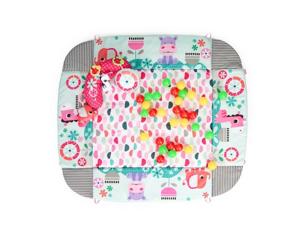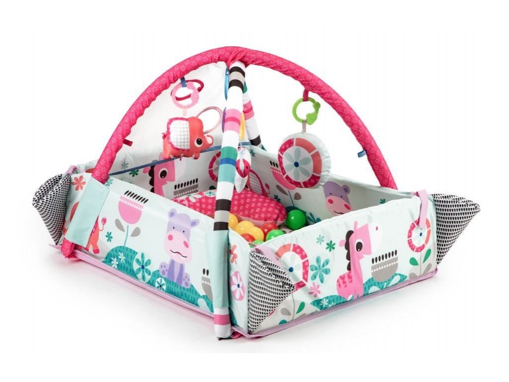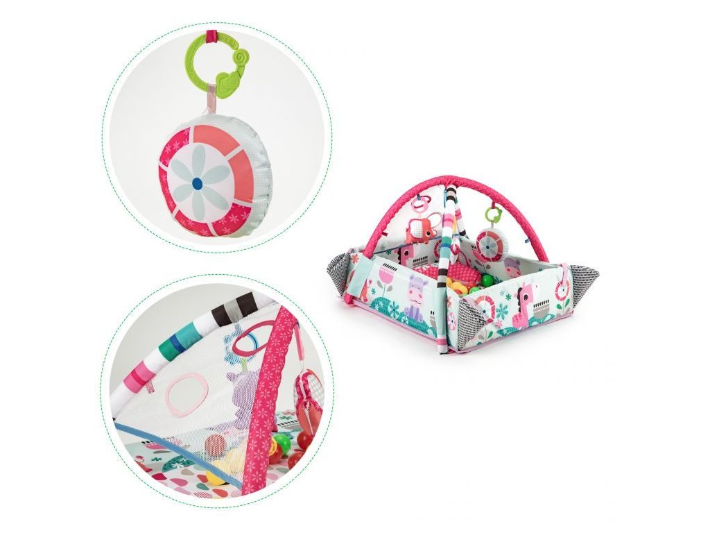 Ecotoys farebná hracia deka so 30 loptičkami je určená Vášmu dieťaťu už od narodenia. Súčasťou deky sú dve hrazdičky so zavesenými hračkami z ktorých je jedna v tvare tigra vydáva po stlačení veselé zvuky. Pomocou bočných stien deky možno vytvoriť ohrádku. Dieťa sa môže hrať niekoľkými spôsobmi podľa toho ako rýchlo rastie a má chuť sa hrať. V prvej fáze života sa dieťa hrá na chrbte a môže pozorovať zavesené hračky, ktoré vzbudzujú jeho zvedavosť. Pre dieťa, ktoré už zvládne väčšie pohyby možno stenu jednoducho zdvihnúť a vytvoriť tak bezpečnú ohrádku pre hranie. Možno využiť samostatnú deku, samostatnú ohrádku alebo skombinovať za pomoci hrazdičiek. Medzi nimi je umiestnená sieťka s otvormi pre vhadzovanie loptičiek. Hračky je možné odobrať a dieťa sa s nimi môže hrať samostatne. Deka je vyrobená zo stálofarebného materiálu.