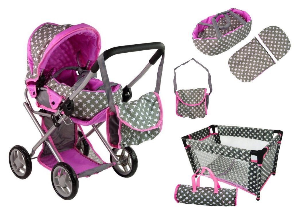 Veľký set pre najmenšie dievčatká. Kombinovaný kočík pre bábiky Alice 9346D má veľmi ľahkú stabilnú konštrukciu vyrobenú z hliníkových rúrok, vrchná časť je z impregnovanej bavlny. Možno ju jednoducho sňať a kedykoľvek vyprať. Rukoväť kočíka je obalená penou. Vnútri kočíka je nosítko s úchytkami a obliečkami slúžiace na prenášanie bábiky. Pred automatickým zložením chráni dieťa blokácie. Bábika je proti vypadnutiu zabezpečená bezpečnostným pásom. Penová kolesá s diskami nezanechávajú šmuhy na podlahe. Set ďalej obsahuje cestovné postieľku, perinku s vankúšikom a tašku na prenos postieľky.
