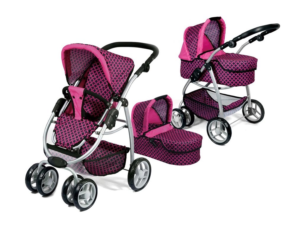 Kombinovaný kočík pre bábiky 3v1 v niekoľkých nádherných farebných prevedeniach. Má veľmi ľahkú stabilnú konštrukciu vyrobenú z hliníkových rúrok, vrchná časť je z impregnovanej bavlny. Možno ju jednoducho odňať a kedykoľvek vyprať. Rukoväť kočíka je nastaviteľná a obalená penou. Vo vnútri kočíka je vanička slúžiaca k jednoduchému prenášaniu bábiky. Pred automatickým zložením chráni dieťa blokácia. Bábika je v športovej verzii proti vypadnutiu zabezpečená bezpečnostným pásom. Jednoduchá zmena z hlbokej na športovú verziu.