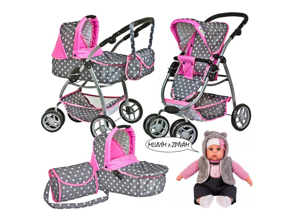 Kombinovaný kočík pre bábiky 3v1 má veľmi ľahkú stabilnú konštrukciu vyrobenú z hliníkových rúrok, vrchná časť je z impregnovanej bavlny. Možno ju jednoducho odňať a kedykoľvek vyprať. Rukoväť kočíka je nastaviteľná a obalená penou. Vo vnútri kočíka je vanička slúžiaca k jednoduchému prenášaniu bábiky. Pred automatickým zložením chráni dieťa blokácia. Bábika je v športovej verzii proti vypadnutiu zabezpečená bezpečnostným pásom. Jednoduchá zmena z hlbokej na športovú verziu.