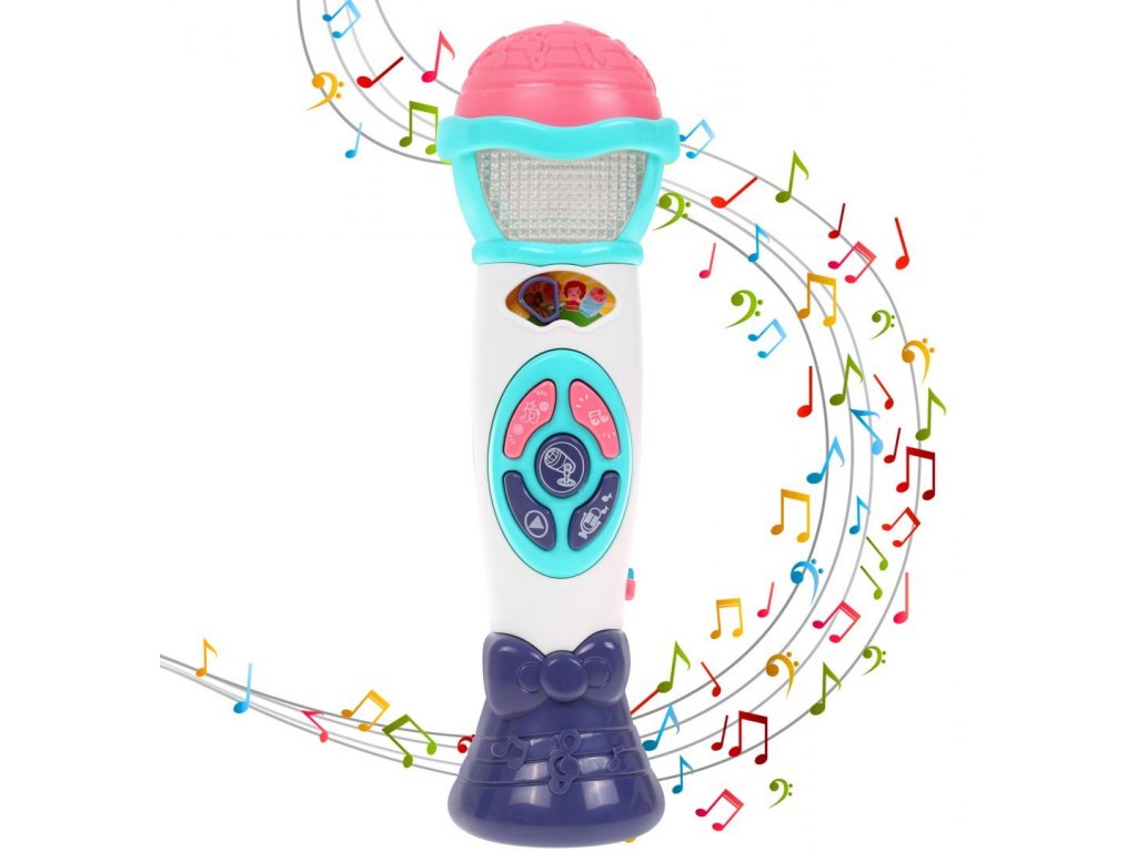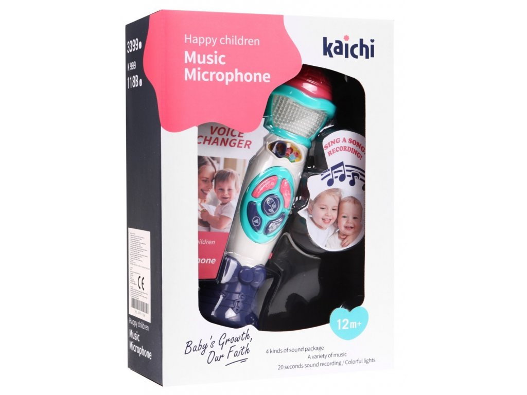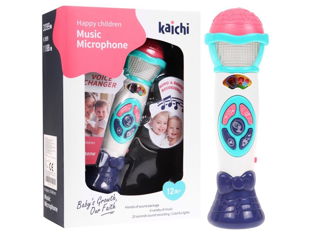 Detský karaoke mikrofón so svetelnými efektmi, možnosťou nahrávania a prehrávania premení Vaše dieťa v skutočnú speváčku alebo speváka. Je vybavený zabudovanou diódou, ktorá vydáva farebné svetielka. Má 20 prednastavených skladieb a má funkciu zmeny hlasu v 4 rôznych hudobných štýloch. Hračka je vyrobená z kvalitného plastu a určená pre deti od 12 mesiacov.