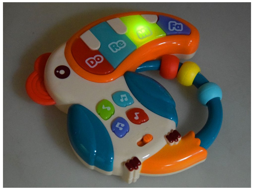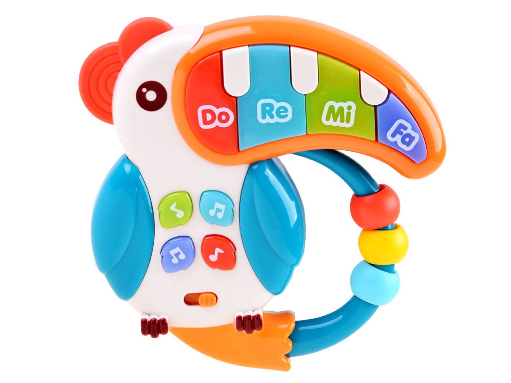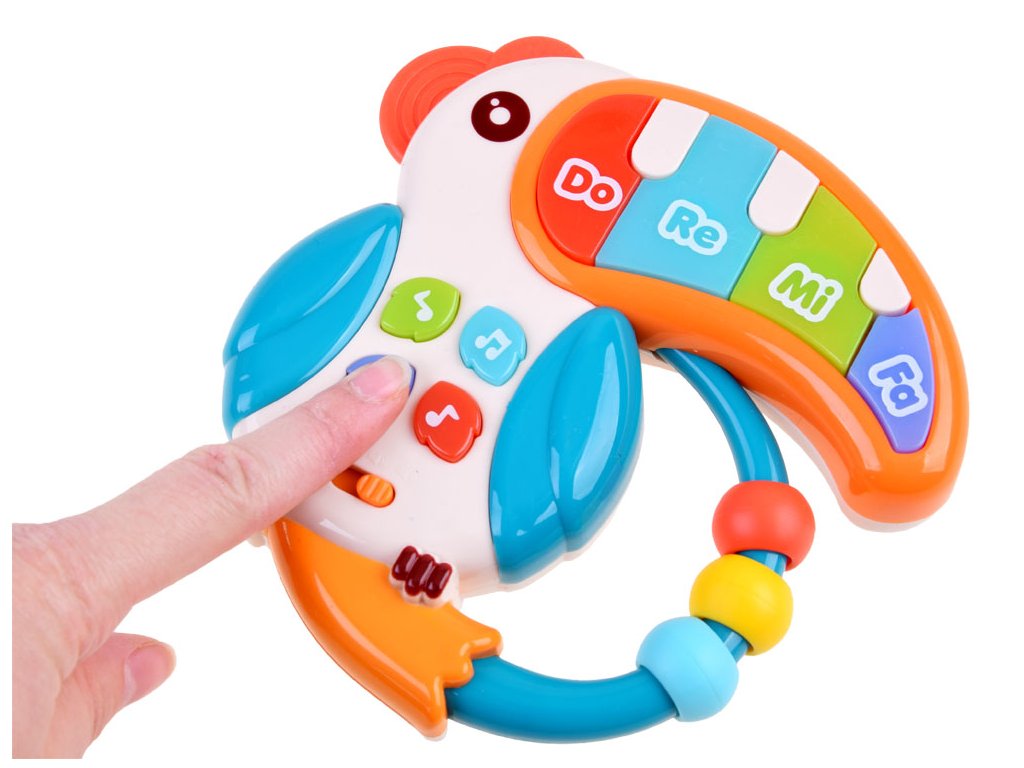 Haunger interaktívny hrajúci Tukan je určený pre tie najmenšie deti. Hračka má tieto funkcie: na zobáčiku sú klávesy, na ktorých môže dieťa hrať stupnicu do, re, mi, fa. Dole sú potom štyri farebné tlačidlá s notami, ktoré prehrávajú veselé a pokojné melódie a tiež zvuky vtáčikov. Zobáčik je pri hre podsvietený. Na rukoväti sú umiestnené 3 farebné korálky. vo výbave je tiež dvojstupňová regulácia hlasitosti. Hračka má na hlave aj gumový hrebienok, ktorý je možné použiť ako hryzátko. Hračka je určená pre deti od 18 mesiacov veku.