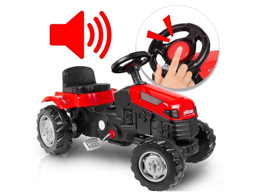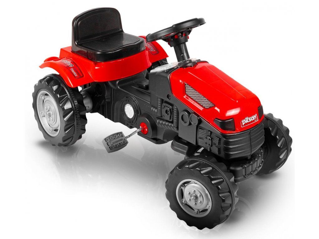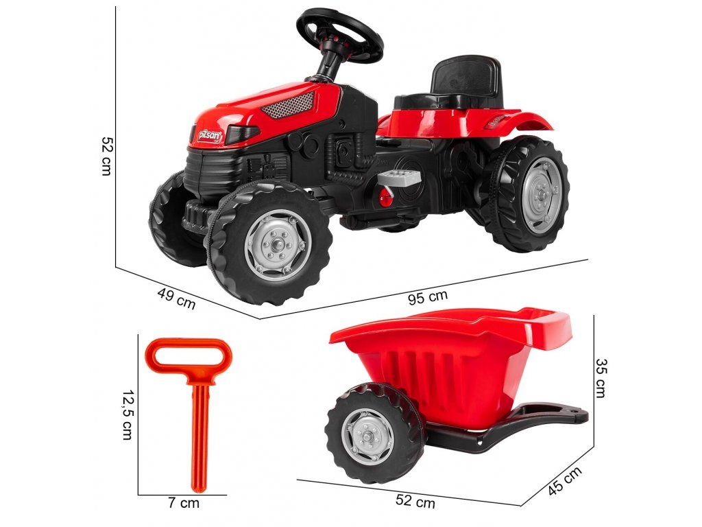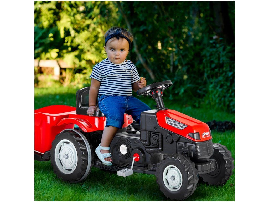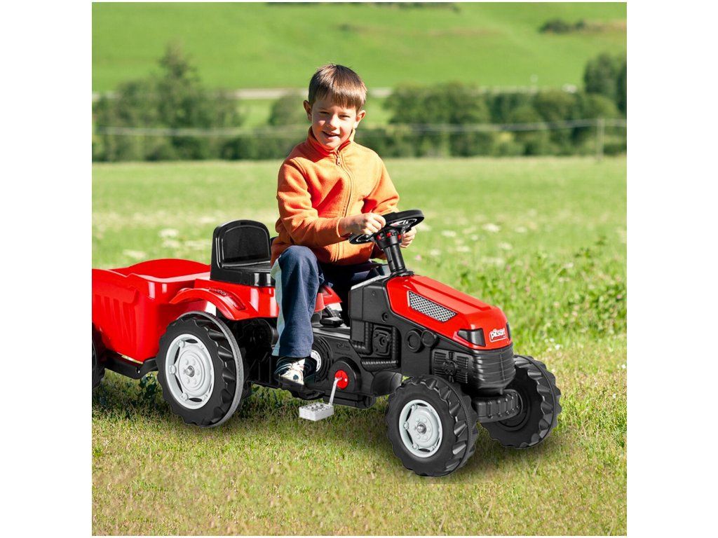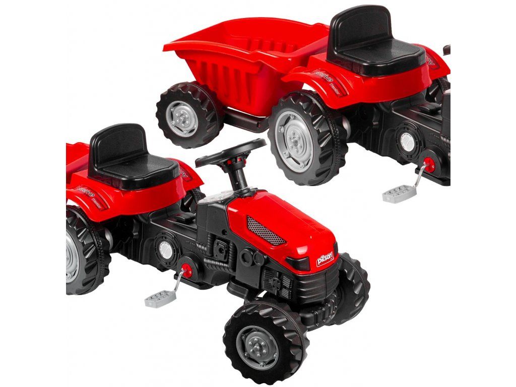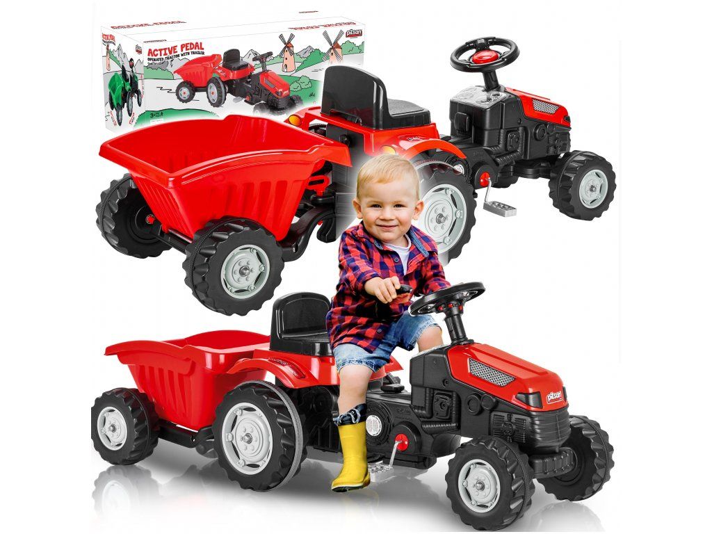 Detský šliapací traktor s prívesom je určený pre deti od 3 rokov a hmotnosti do 30 kg. Pohon zaisťuje reťaz. Traktor má otáčavé predné kolesá, ktoré sa ovládajú pomocou volantu. Vo volante je tiež umiestnený klaksón. Sedadlo je regulovateľné v dvoch pozíciách. Je vyrobený z plastu a vyznačuje sa veľmi nízkou hmotnosťou.