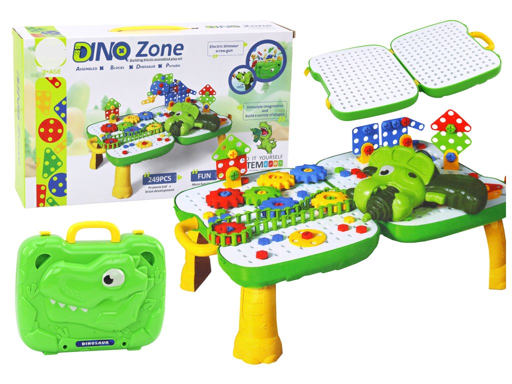 Farebná konštrukčná stavebnica Dino Zone v praktickom kufríku so stolíkom a horným úchytom je ideálnou hračkou pre chlapcov aj dievčatká. Súčasťou je vŕtačka na batérie v tvare dinosaura. Celkom je v sade obsiahnutých 249 ks rôznych konštrukčných prvkov v rôznych farbách, z ktorých je možné skrutkovaním pomocou ľubovoľne vytvárať obrazce, mozaiky, vzory a priestorové obrazce. Všetko záleží len na predstavivosti dieťaťa. Hra so stavebnicou podporuje u detí predstavivosť, motorické schopnosti a trpezlivosť. Hračka je určená pre deti od 36 mesiacov veku.