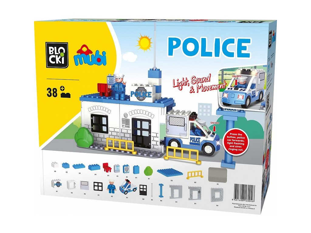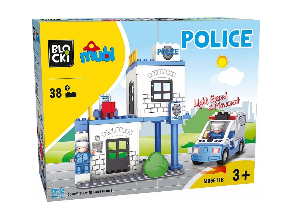 Stavebnica Blocki Mubi Policajná stanica so svetlom a zvukmi urobí z Vášho dieťaťa pravého policajta. Súčasťou stavebnice je policajná stanica s ďalším príslušenstvom a 2 figúrky policajtov. Autíčko je napájané batériami a pri pohybe vydáva zvuky a húka. Stavebnica zaručí deťom veľa hodín zábavy, pomôže im rozvíjať kreativitu, manuálne zručnosti a zlepšuje logické myslenie. Stavebnica je kompatibilná so stavebnicami ostatných svetových značiek ako je Lego Duplo a ďalšie. Všetky dieliky stavebnice sa veľmi ľahko prepájajú a sú vyrobené z kvalitného plastu. Táto stavebnica je určená pre deti od 3 rokov.