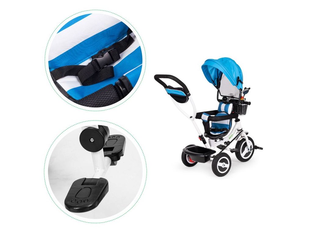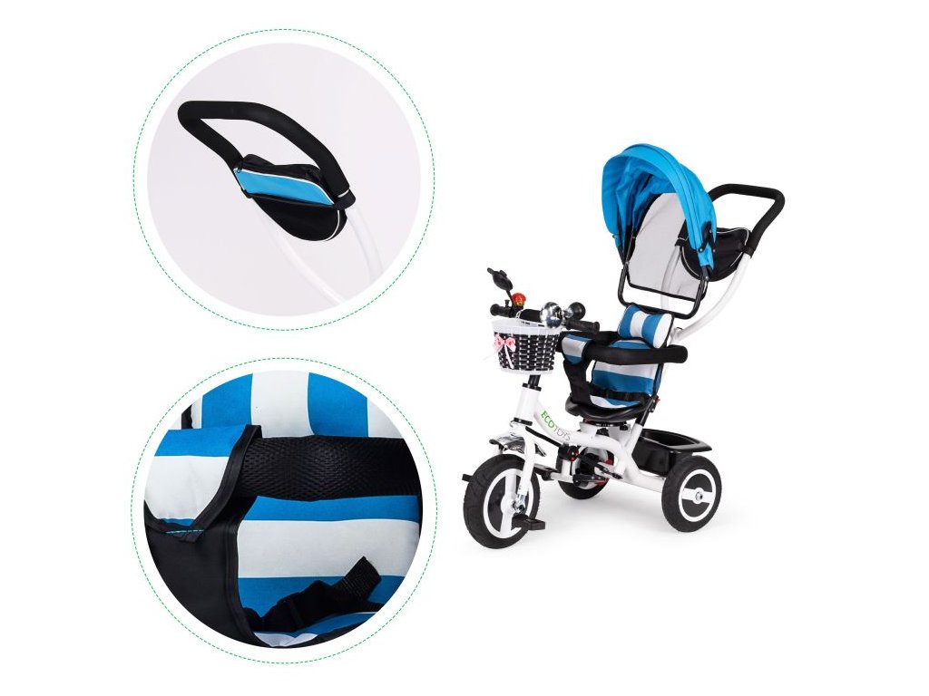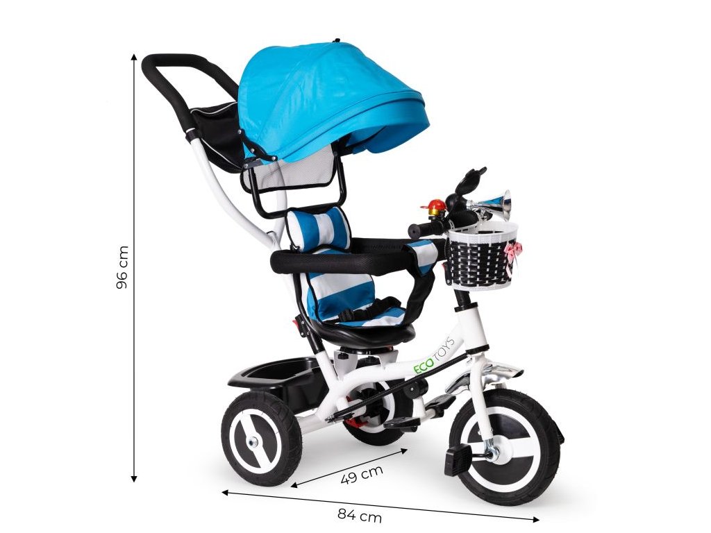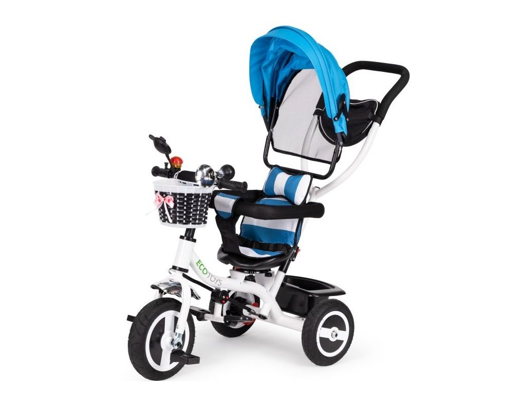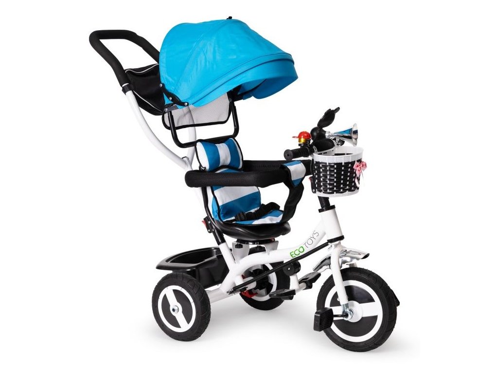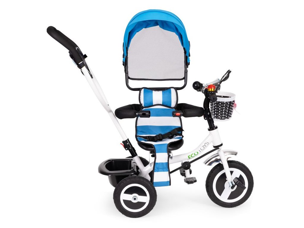 Detská trojkolka Ecotoys s otočným sedadlom. Je určená pre deti od 1 do 5 rokov. Je vybavená praktickou odnímateľnou strieškou proti slnku a dažďu. V zadnej časti je umiestnený veľký kôš na hračky, v prednej časti menší košík. Trojkolka má pevnú oceľovú konštrukciu a odolné kolesá usadené v pevných plastových ráfikoch. Držadlo a bezpečnostný pás zabraňujú vypadnutiu dieťaťa. Na kormidle je zvonček. Pre väčšiu bezpečnosť môžu trojkolku riadiť aj rodičia a zadné kolesá majú 2 nezávislé brzdy. Sedadlo možno otočiť o 360 ° a to v smere jazdy alebo čelom k rodičovi, čo navyše uľahčí nastupovanie najmenším deťom.